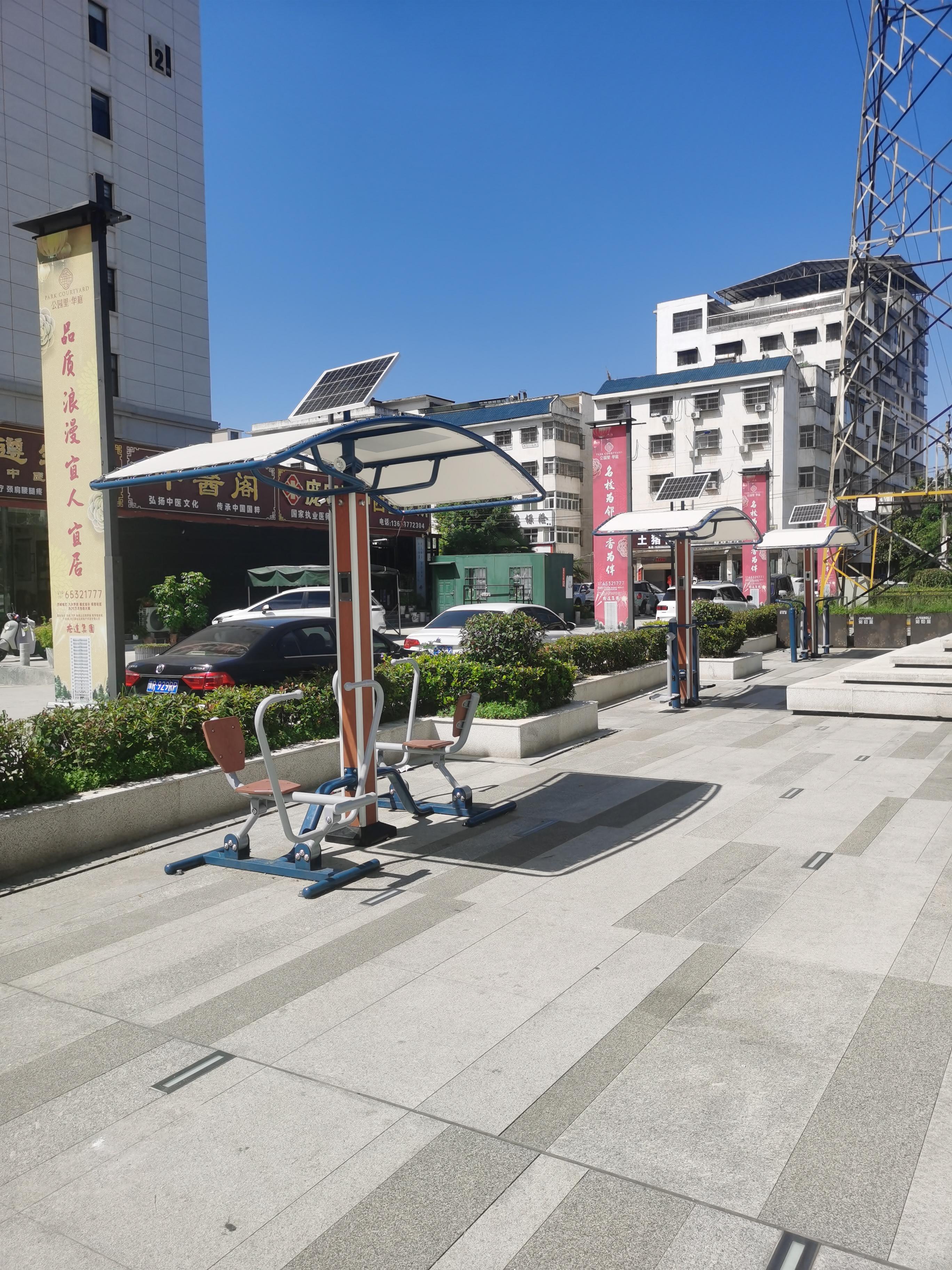 组合式健身站:多件器材组合一体,占地小、功能全,多用于小区小广场、口袋公园、乡村小场地。其性价比高、易安装、易维护,为小场地提供了有效的健身解决方案。
