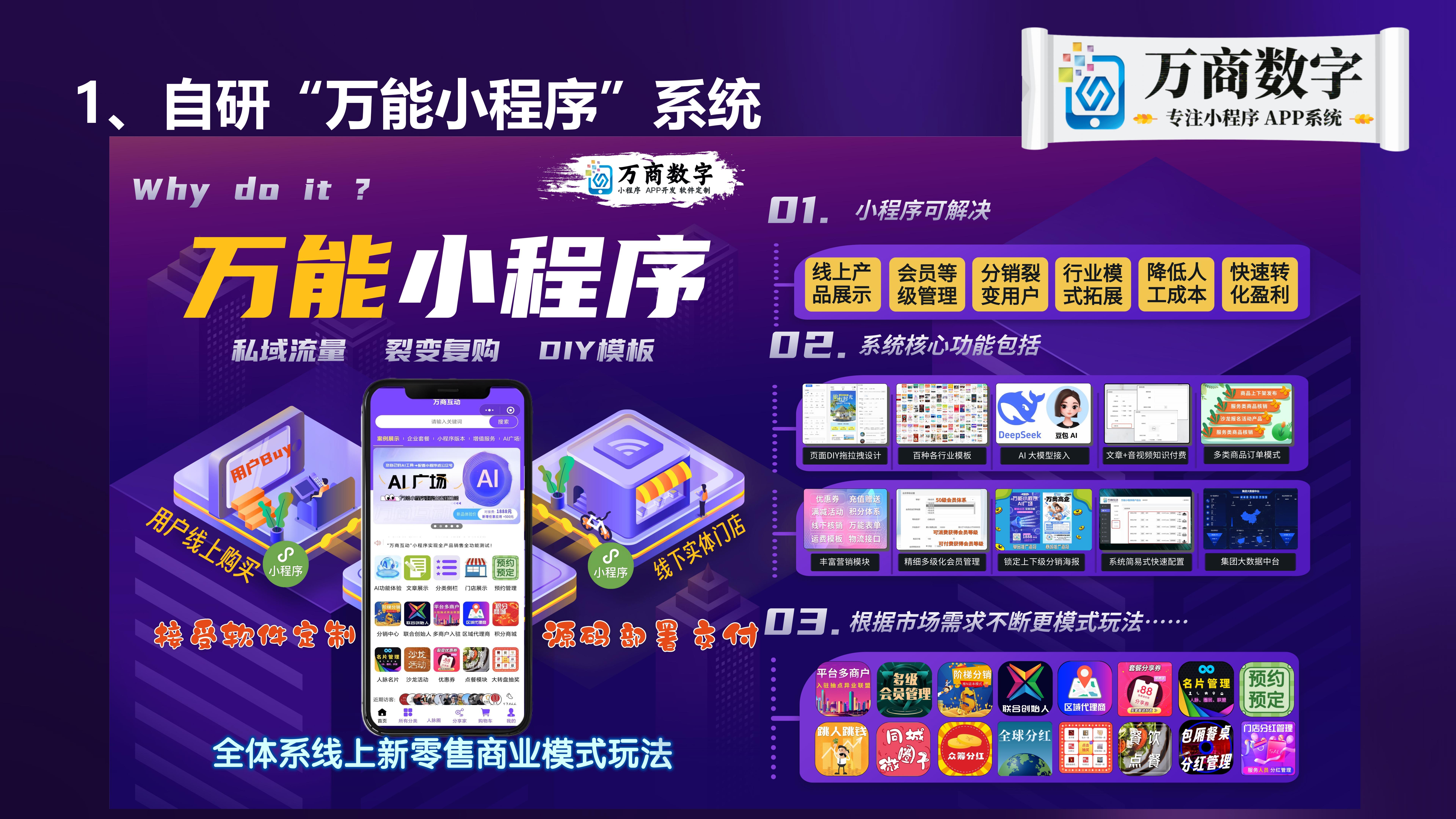 首先是自研“万商小程序”系统,这是面向多行业场景的标准化的模块小程序产品,支持企业线上营销。其核心功能丰富,包括电商交易、内容展示、会员管理、分销体系、联创分红、区域代理商、名片管理、沙龙活动、房源管理、股东分红、裂变优惠券、餐饮点餐、包厢分红、门店分红、预约预定、同城圈子、积分管理、九宫格抽奖等基础功能模块。该系统能够满足不同企业的多样化需求,助力企业在微信平台上开展有效的营销活动。