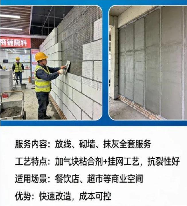 在商铺领域,为某商业综合体的数十家商铺进行隔墙施工。根据不同商铺的经营需求,灵活调整墙体厚度与施工方案,既满足了商铺的空间布局要求,又保证了施工进度,助力商铺按时开业。加气块隔墙的施工速度快,能够在短时间内完成施工任务,不影响商铺的正常开业。而且加气块的可加工性强,可以根据商铺的设计要求进行切割、拼接,满足各种个性化的需求。
