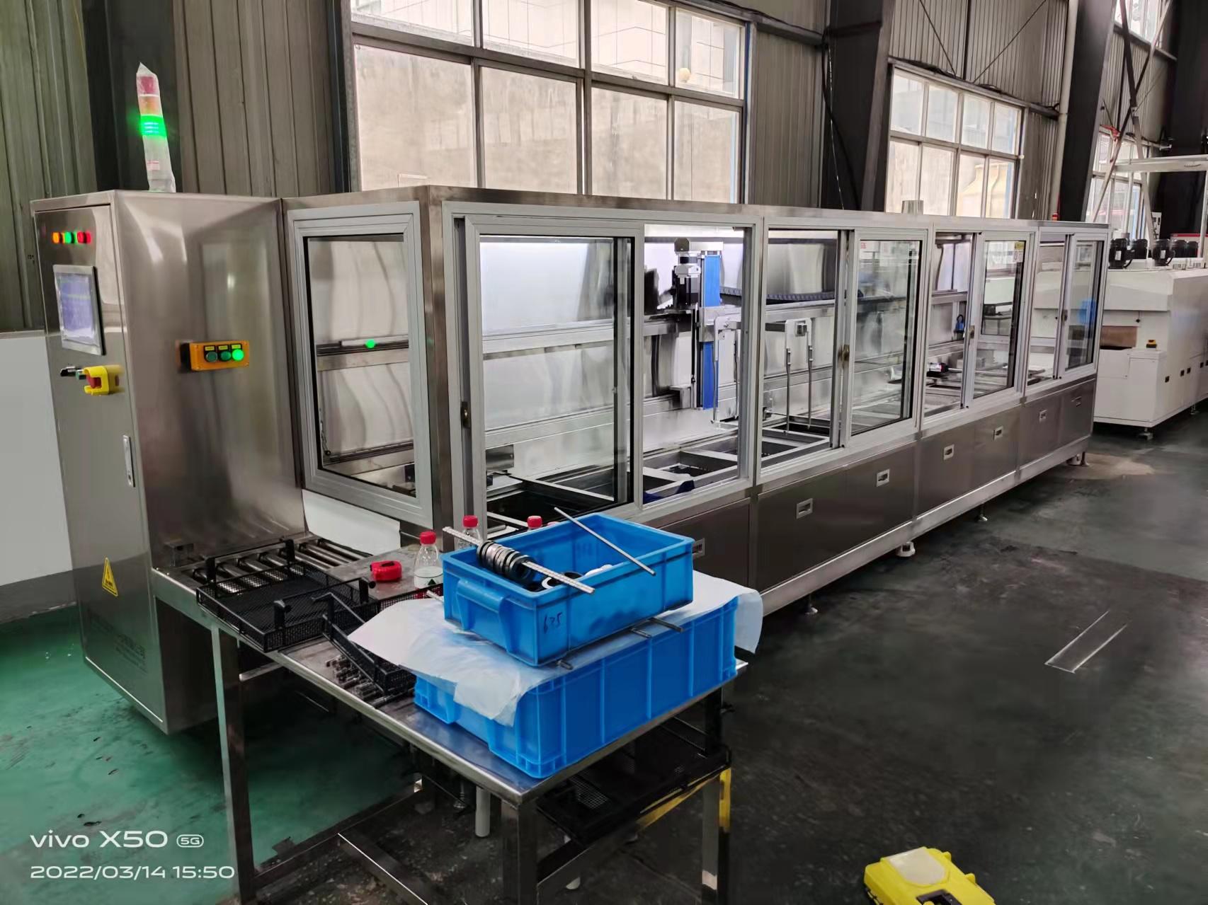 清洗性能方面,超声参数处于行业中上水平,频率有 28/40/68/80kHz(多频可选),功率密度 0.3–0.8W/cm²,连续可调,空化效果均匀、强劲,盲孔 / 夹缝 / 深槽清洗干净。清洗工艺形成完整闭环,标配超声清洗 + 循环过滤 + 加热 + 漂洗 + 烘干,还可选抛动 / 鼓泡 / 喷淋 / 慢拉 / 热风 / 真空干燥,典型线为上料→超声→漂洗→喷淋→防锈→风切→烘干→冷却→下料,自动化与一致性方面,PLC 全自动,节拍精准、批次稳定性高,机械臂 / 网带 / 履带传送,减少人工、效率高。