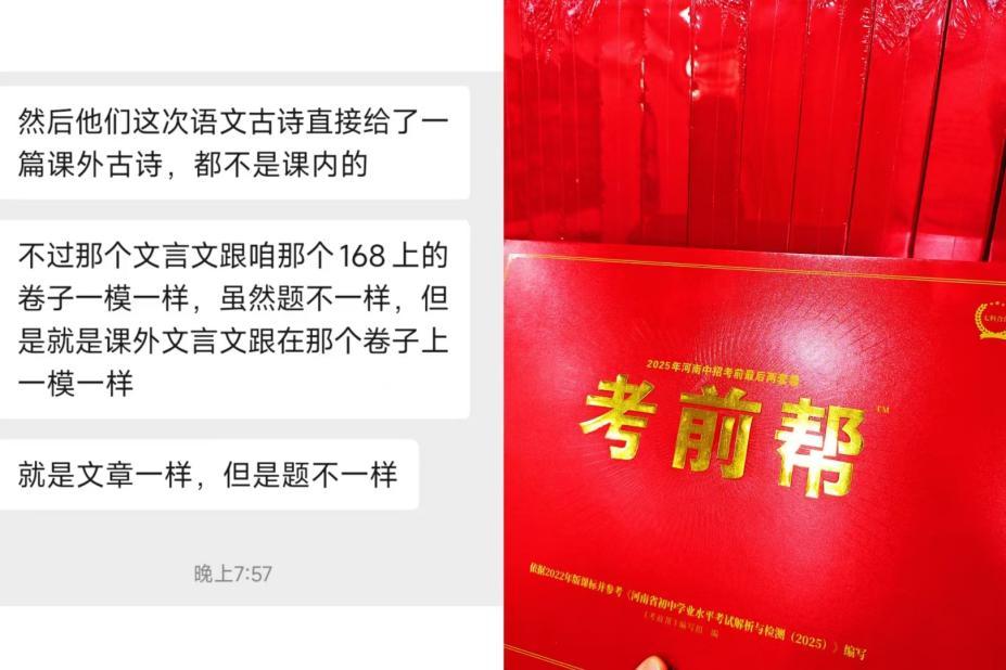 《考前帮》由河南理想图书发行有限公司荣誉发行,自上市以来便备受瞩目。它创新的卷卷互补、卷册互补、读写互补的内容设计,搭配精美的包装,一经推出就吸引了众多目光。而其猜押实力更是不容小觑,自2021年上市以来,《考前帮》连续五年精准贴中河南中考真题,助力无数考生在考场上脱颖而出,实现轻松提分。
