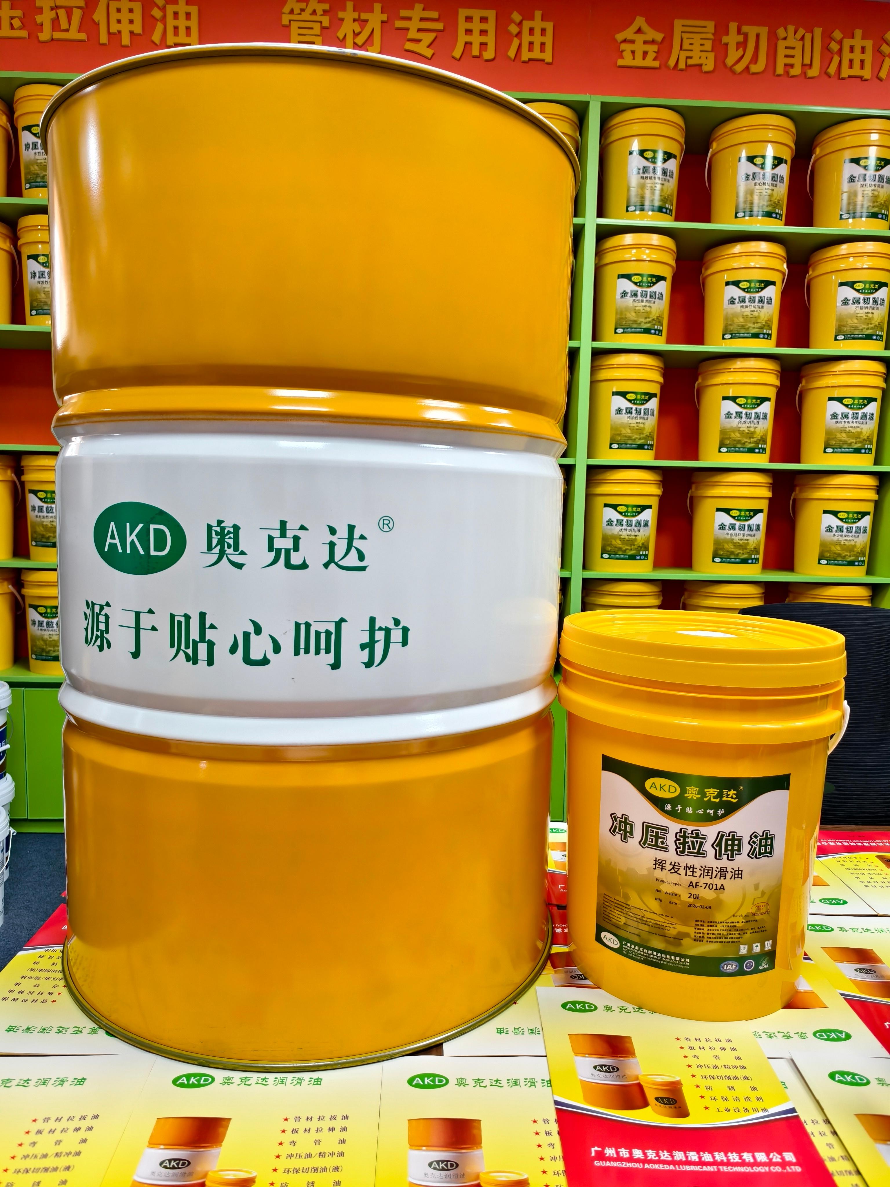 AKD油性拉伸油系列产品包括铁材拉伸油、不锈钢拉伸油、铜铝拉伸油、挥发性冲压拉伸油、防锈拉伸油、免洗冲压油、挥发冲剪油、铝箔冲压油等。这类产品满足各种板材的冲压深拉伸需求,防止产品拉裂拉爆,针对薄板的连续冲压拉伸,可以实现后续免清洗工艺。