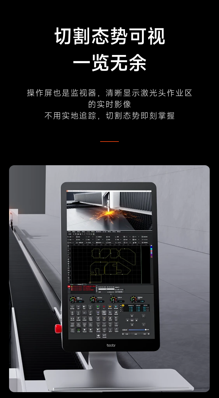 其BodorThinker操作系统,采用先进的系统架构和EtherCat总线通讯协议,较短通讯响应达1ms,闭环控制,内置排版,功能丰富。用十年的生产经验为客户带来较好的操作体验。采用实时控制技术来确保对机床的实时响应和准确控制;采用先进的PID控制、轨迹规划等算法,实现平滑的运动轨迹和高精度的加工操作,可根据加工要求及机床特性进行参数自动调整,提高设备的动态性能、加工效率、加工精度;根据实时加工状态及反馈信息,自动调整控制策略,可适应不同的加工场景,提高加工质量和稳定性;通过收集和分析加工数据,识别机床内部潜在问题,优化机床参数,提高生产效率,采用机器学习算法进行加工过程的预测和优化,提升切割效果,减少加工时间和设备损耗;支持MES与ERP系统的集成,通过标准的通信协议和接口,实现生产过程自动化管理和信息交换。