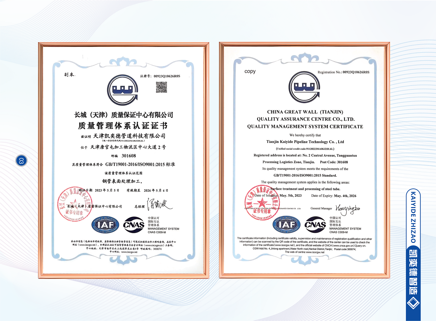 在售后服务方面,天津凯奕德管道科技有限公司拥有一支集技术与销售为一体的、年轻而富有朝气的团队。有专业的销售工程师提供整套解决方案,并拥有一套成熟的现代化管理体制。从产品的生产、配送到安装、调试以及售后都有完整的一条龙服务体系。公司与中石油、中石化、中国水务、中国燃气、雄安新区、友发钢管、京华制管、正大制管等单位均有良好的合作关系。
