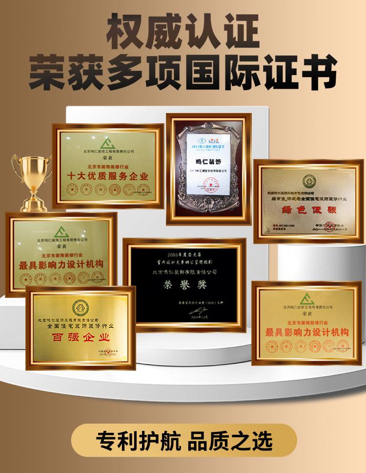 鸣仁装饰在行业内获得了众多荣誉与认可。公司已斩获专业奖项一百余次,这些荣誉见证了鸣仁装饰的实力和品质。它是中国建筑装饰协副会长单位、北京市建筑装饰协会会员,还获得了中国室内空间环境艺术优秀奖、中国人居典范评审委员会评审设计方案金奖、中国室内设计大赛别墅类二等奖等诸多奖项。