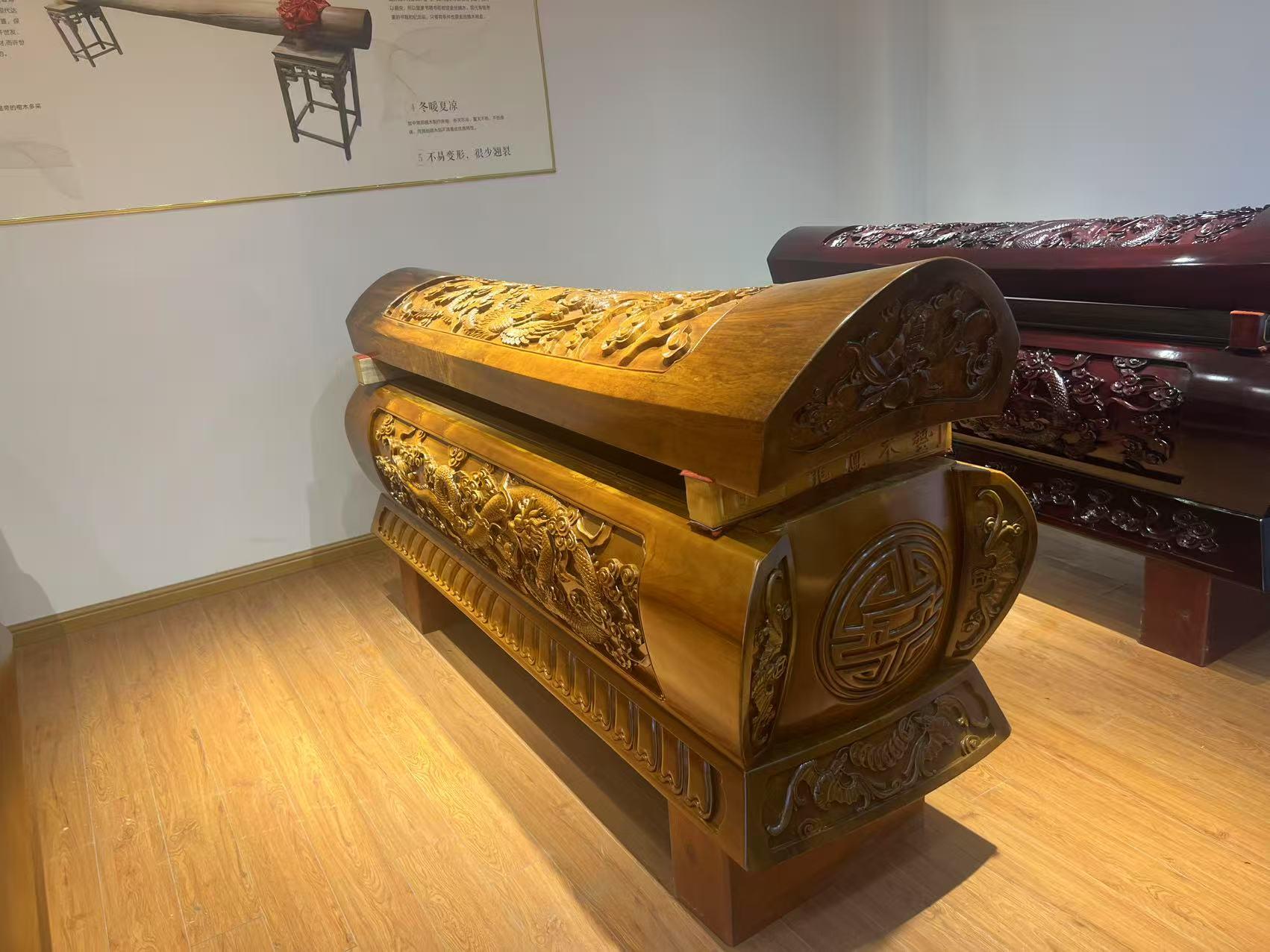 楠木棺材产品是公司的主打产品之一。楠木具有抗腐防虫、不易开裂的特点,且金丝明显、纹理细腻。公司坚持使用整板古树料,不拼不补,在楠木领域用料口碑突出。这种扎实的用料,保证了棺材的质量和品质,也体现了公司对产品的严格要求。