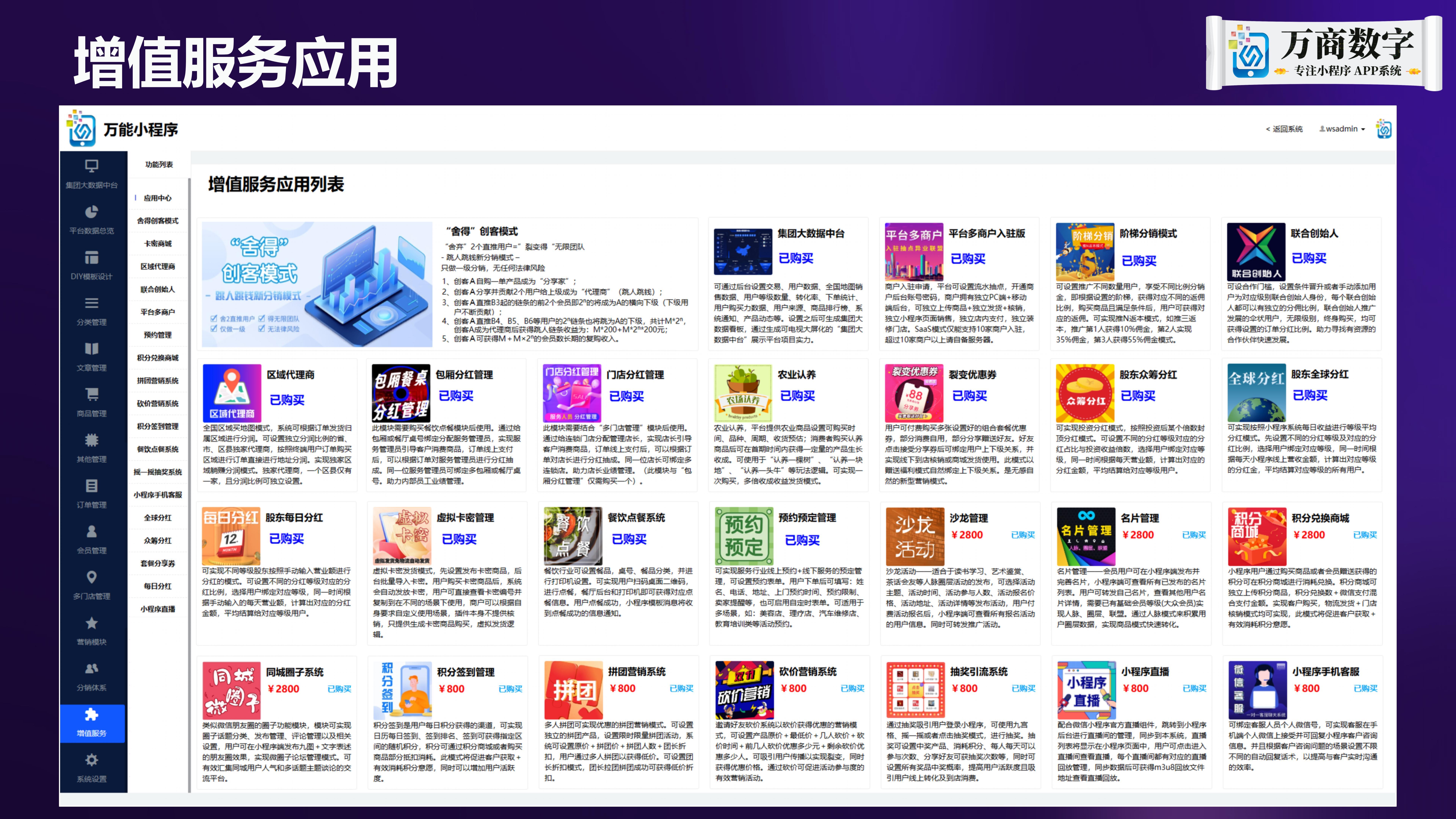 万商数字拥有强大的技术实力,主营自研发的小程序系统、集合式移动营销软件系统以及小程序 APP 软件定制等服务。公司拥有五十几项专利,合作客户广泛,包括厦门大学、海信集团空调、瑞尔特卫浴股份、盈趣科技股份等众多知名企事业单位。