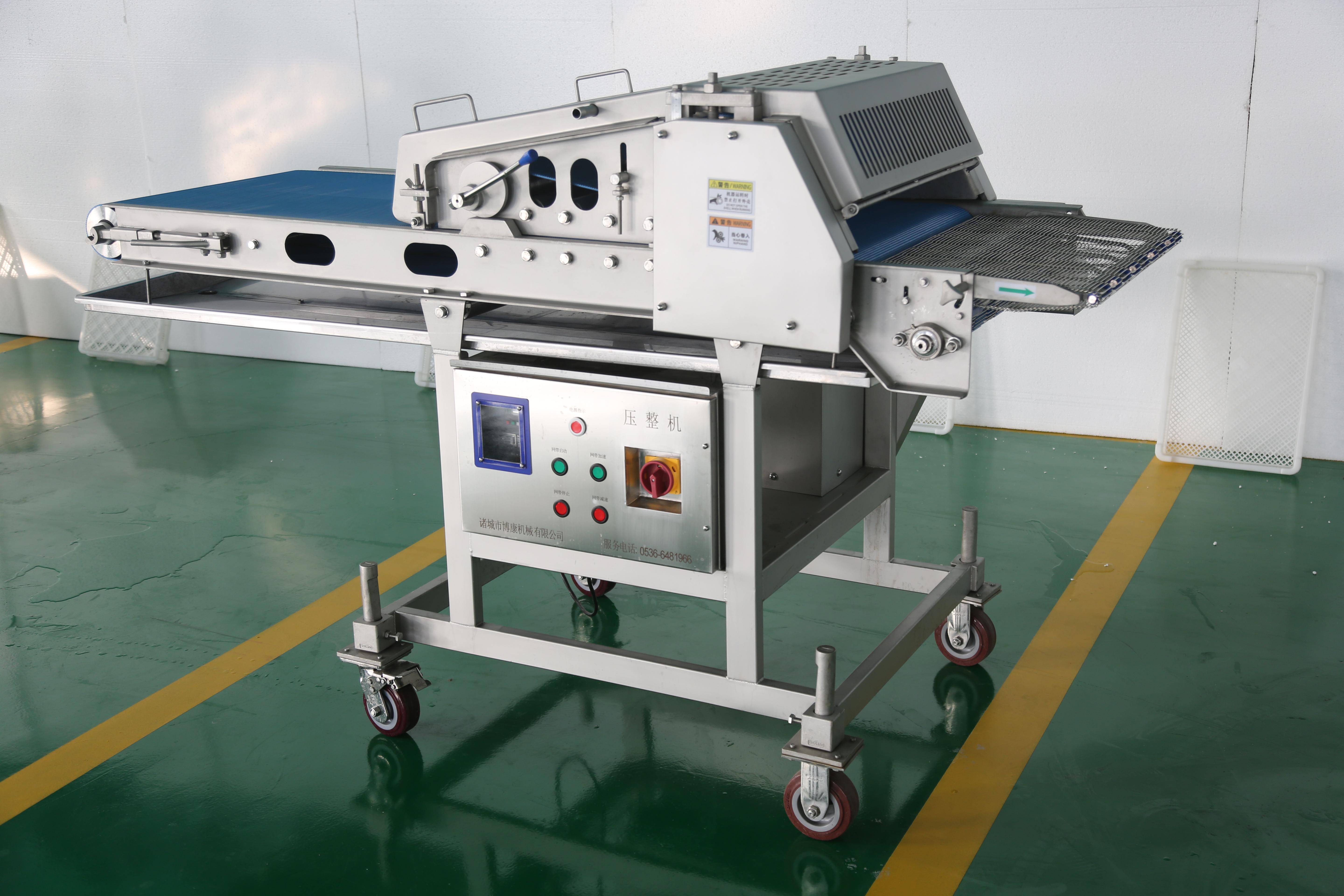 猪排压整机:猪排压整机是诸城市博康机械有限公司的重要产品之一。它能够将猪排进行有效的压整,使猪排的形状更加规整,厚度更加均匀。在实际应用中,经过猪排压整机处理后的猪排,在烹饪过程中受热更加均匀,口感也更好。该设备采用先进的技术和优质的材料制造,操作简单方便,能够满足不同规模肉类加工企业的需求。