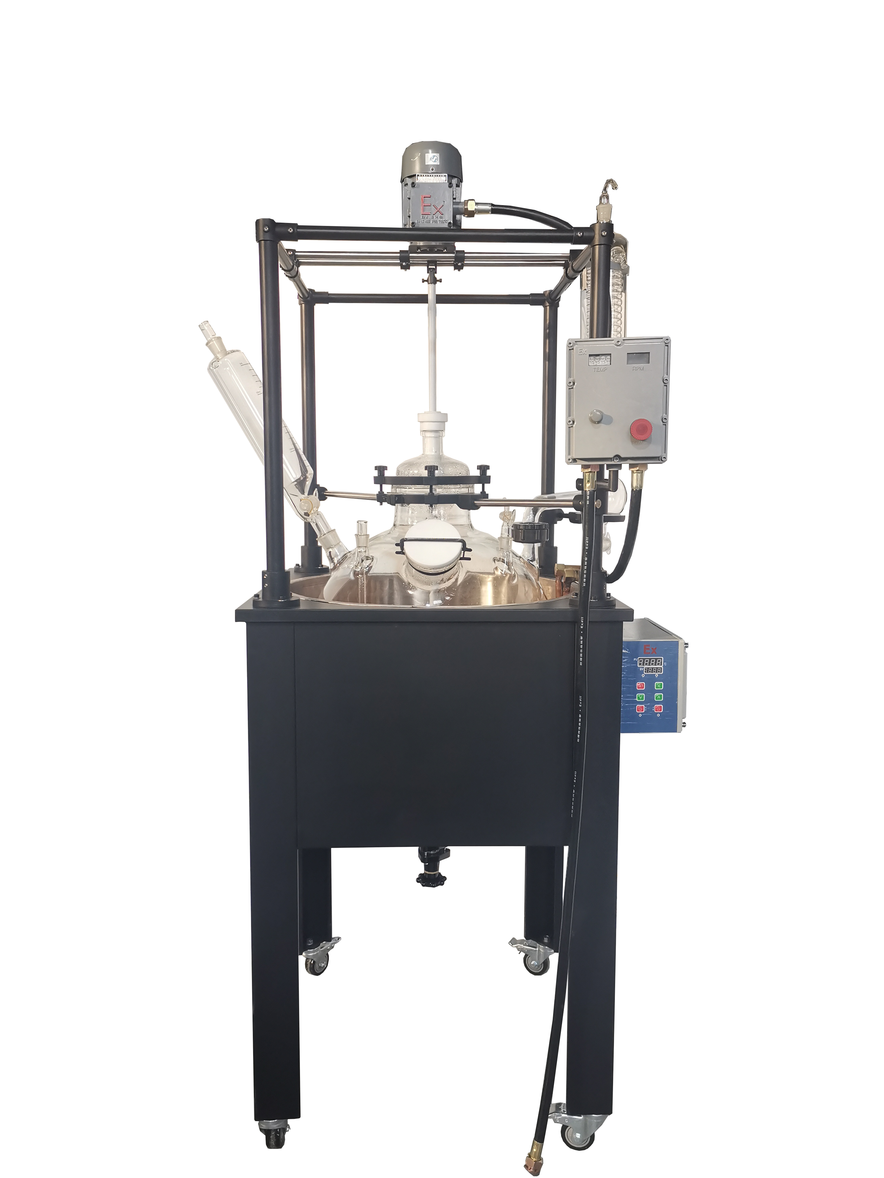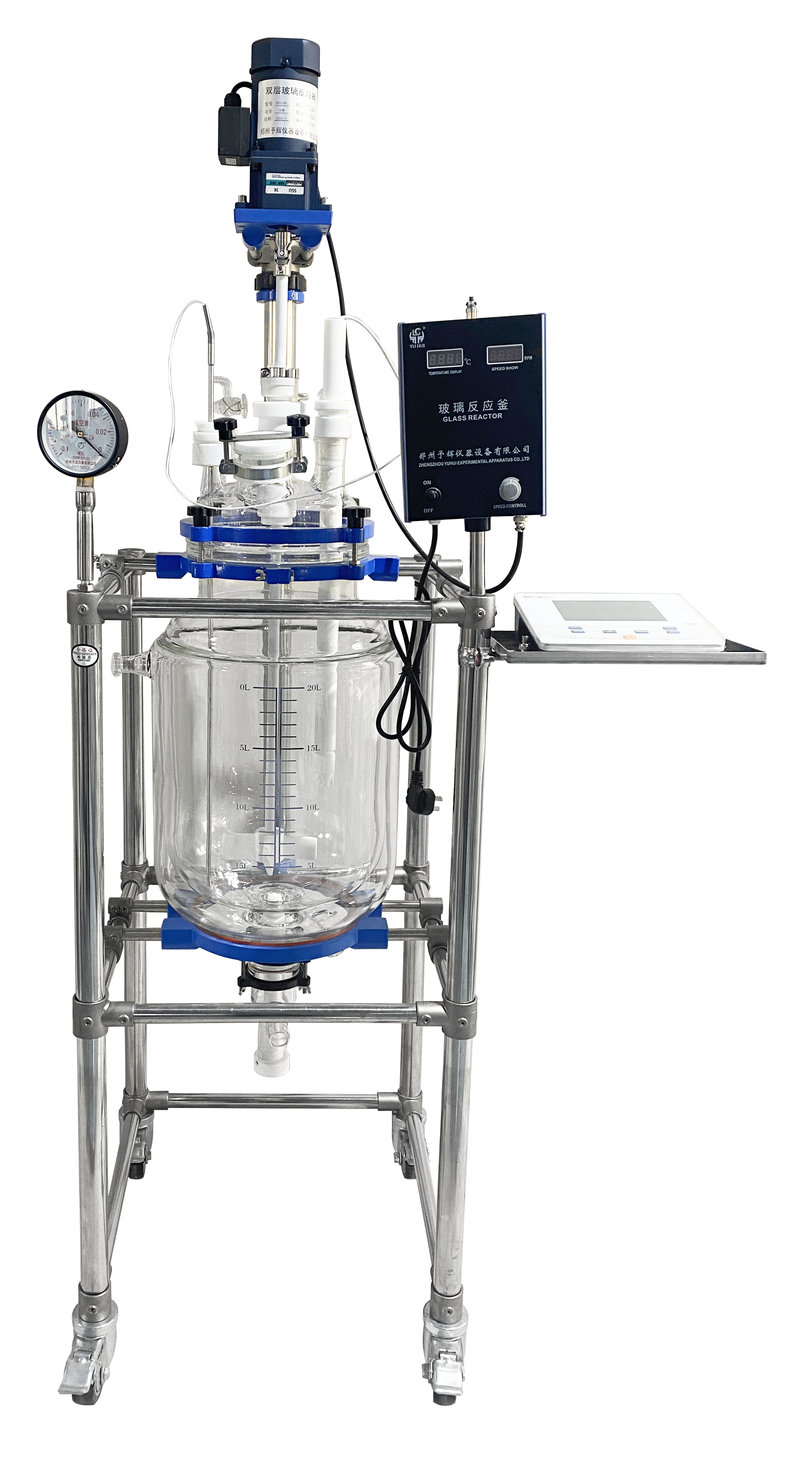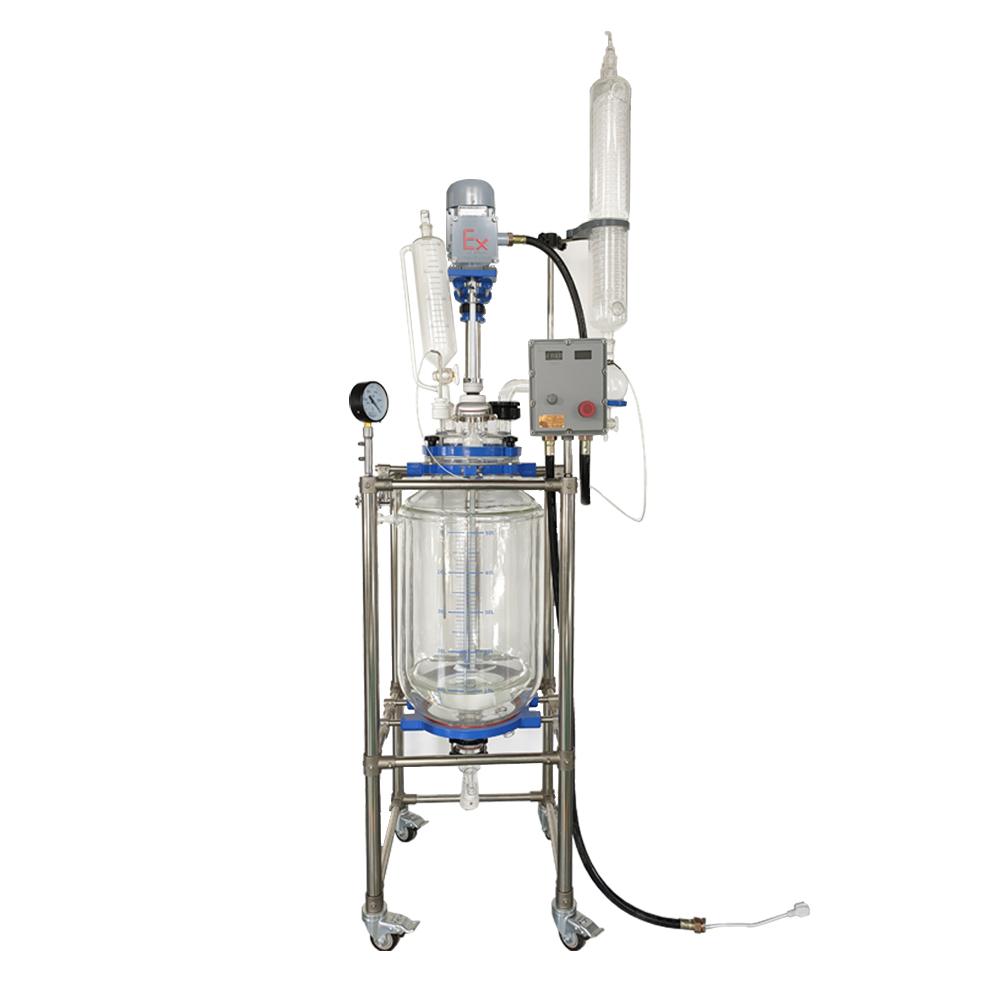 其产品特点十分显著:1、反应釜为双层设计,GG3.3高硼硅玻璃材质,*高温度可以达到250℃,*低温可以达到-80℃,玻璃厚度:5 - 7mm,方便观察物料的反应情况。2、玻璃釜体上开口大口径设计,十分方便清洗。3、采用大功率的搅拌电机,无火花,安全可靠,寿命长,万向节连接,数字显示温度、数显变频调速器。4、固定支架为不锈钢,操作方便,稳定性好,可平稳移动。5、釜盖为六口标准口设计,釜盖开口: 搅拌口,蛇型冷凝口,放气阀口,恒压漏斗口,测温口,固体投料口(5L以下无此口)。6、搅拌杆为不锈钢内芯外为四氟材料。7、搅拌轴机械密封、气密性好,不漏气,具有优良的化学耐受性。8、下放料设计为四氟顶针式可拆卸的,便于固体和颗粒以及粘酬度大的反应物料的顺利放出,无死角,无夹料。9、釜体上有刻度。