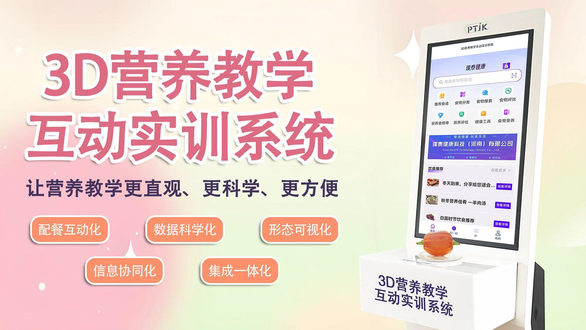 璞泰健康科技(河南)有限公司围绕两大创新系统构建核心产品与服务,即3D营养教学互动实训系统与多样人群营养支持健康教育系统。二者共同构成了“软件 + 硬件 + 智能模型”的一体化解决方案,旨在彻底革新传统的营养教学模式与健康管理实践。
