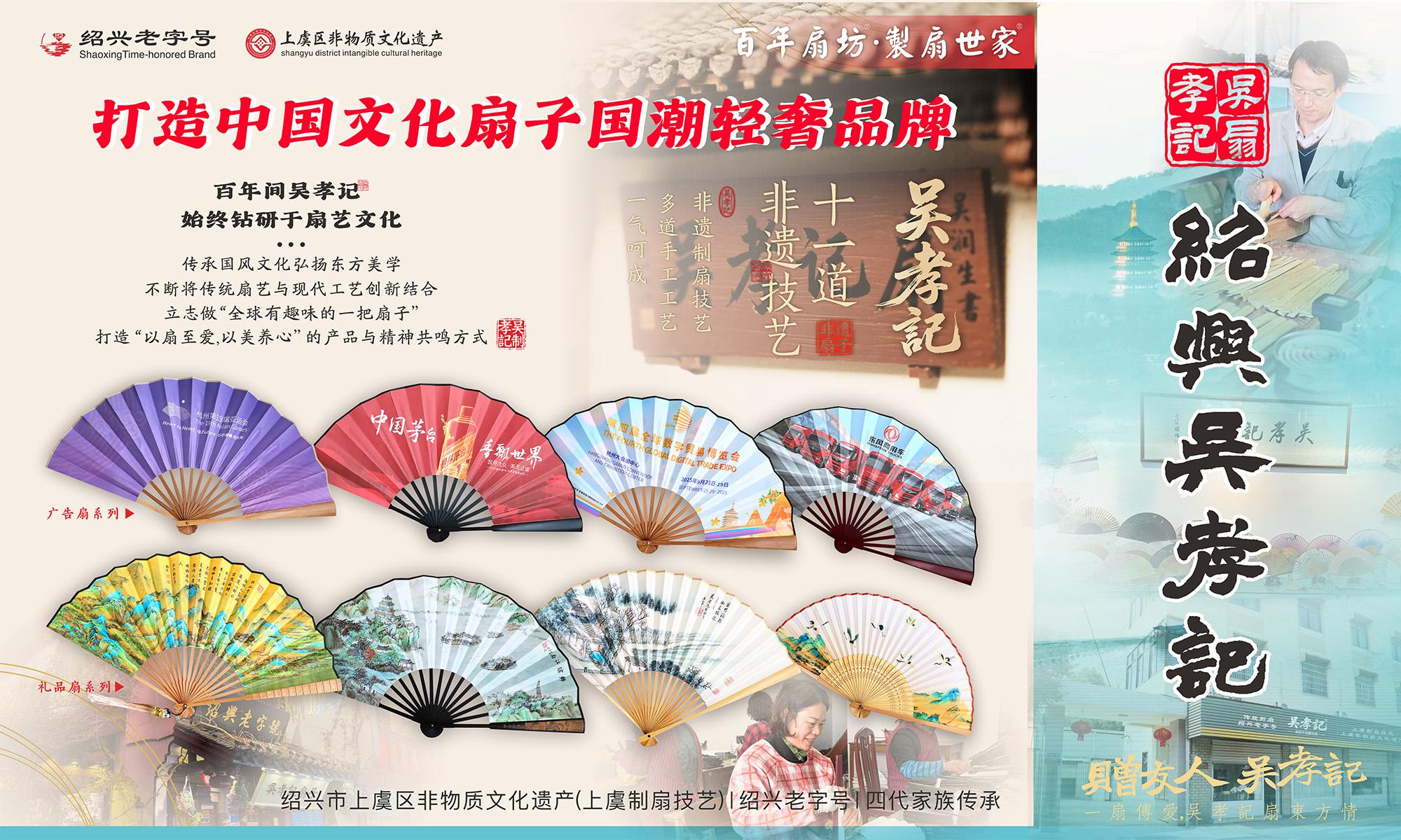 绍兴吴扇匠工艺品有限公司有着独特的发展历程和企业文化。“吴孝记”创始于民国初期(1928年),以“竹骨为魂、绢纸凝韵”的制扇技艺闻名绍兴,历经吴氏家族四代传承,企业积淀了独特的制扇技艺和扇艺文化,该制扇技艺已被列为绍兴市“上虞区非物质文化遗产(上虞制扇技艺)”。吴孝记扇走具有中国文化特色的文创发展之路,坚定不移地发扬“以爱为体,新学为用”的企业文化;恪守“孝义育人、和信待人”的家训;谨守“制扇如修身”的店规;秉承自由创新的工匠精神;打造至臻品质的匠心之物;探索“以扇至爱,以美养心”的心物共鸣;倡导“因爱而美,向善而福”的新仁风尚。目前,企业已从单一扇子生产,逐步发展为涵盖个性化IP创意产品矩阵化的现代服务企业,产品远销海内外市场。