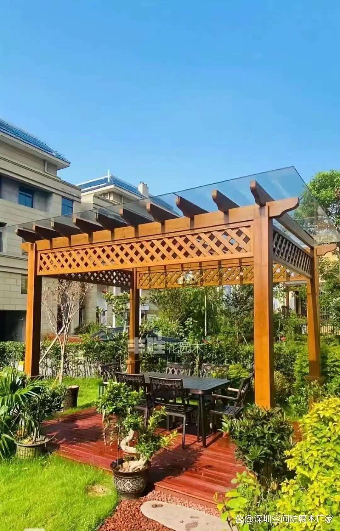 **庭院防腐木**:主要用于庭院的建设,如搭建庭院的亭子、围栏、花架等。它具有良好的防腐性能,能够抵御各种自然环境的侵蚀,保证庭院设施的长期使用。同时,其外观美观,可以为庭院增添自然、温馨的氛围。