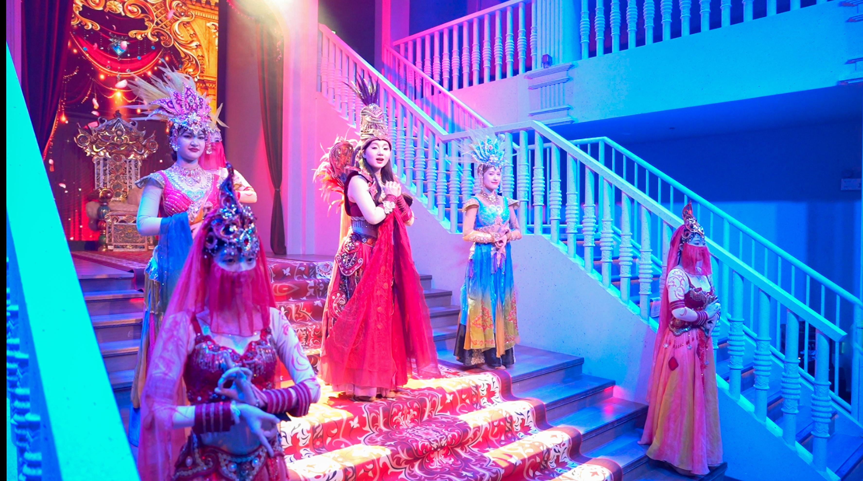 从规模与承载方面来看,街区占地面积3.16万平方米(约85亩),包含室外城楼广场与室内沉浸街区。拥有约70人的专业演员团队,平日每日演出约20场,大型节假日可达30 - 100场,主剧单场时长25 - 40分钟。试营业以来入园48万人次,单日承载量可达10,000人,节假日客流峰值显著。演艺体系构建了《盛世传丝》、《历史足迹》、《乞寒之夜》、《千年之约》、《胡姬酒肆》、《消失之谜》6大核心剧目,每日演出20场(节假日可达100场),360度沉浸式丝路风情互动演绎,形成“全天循环、处处有戏”的观演体验。2026年新增《戏梦丝路·馕秀》和《大上海》两大剧目,并引入NPC剧本杀、高空绸吊,擀毡舞,舞蹈快闪,乐器互动,草帽互动,小丑互动及互动魔术等互动环节,极大增强了游客的参与感与沉浸感。