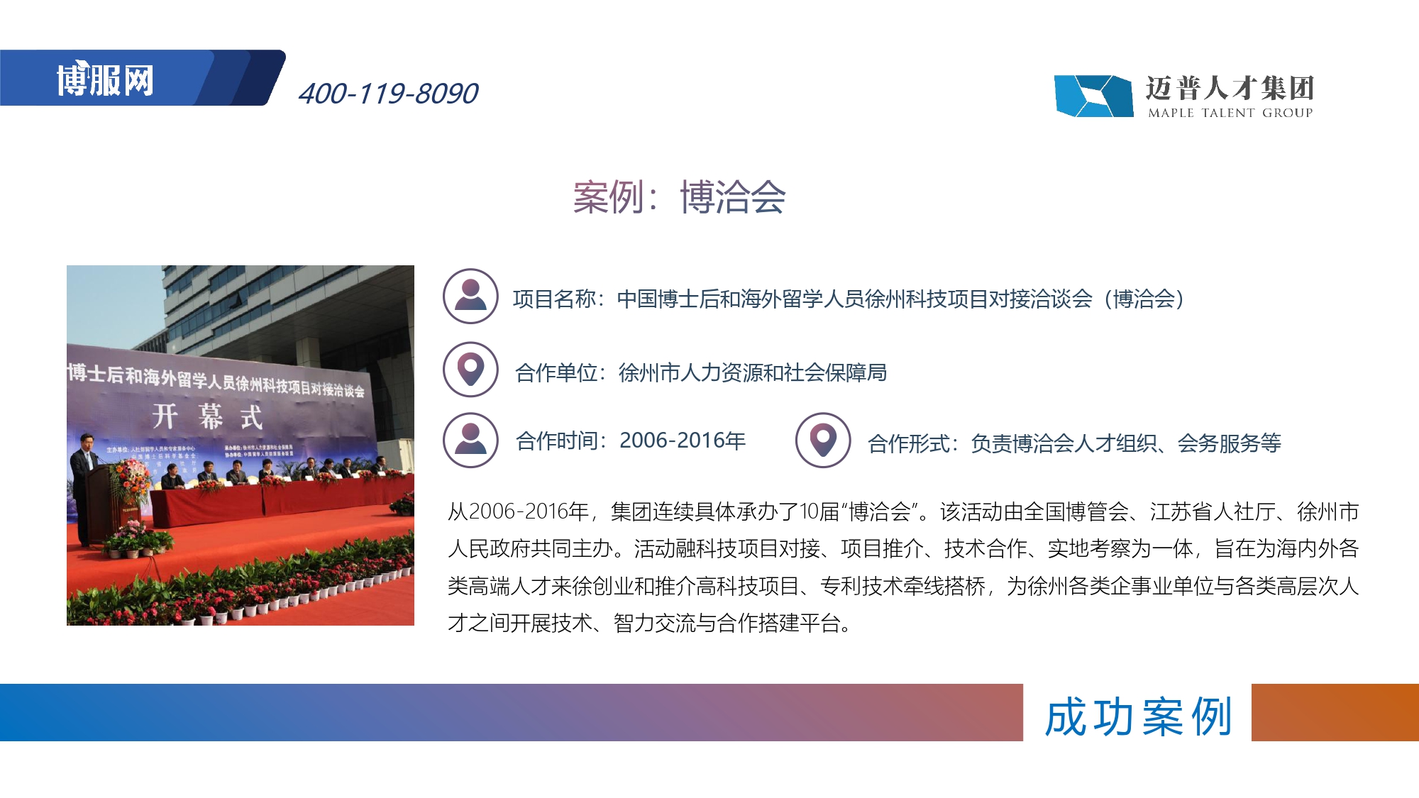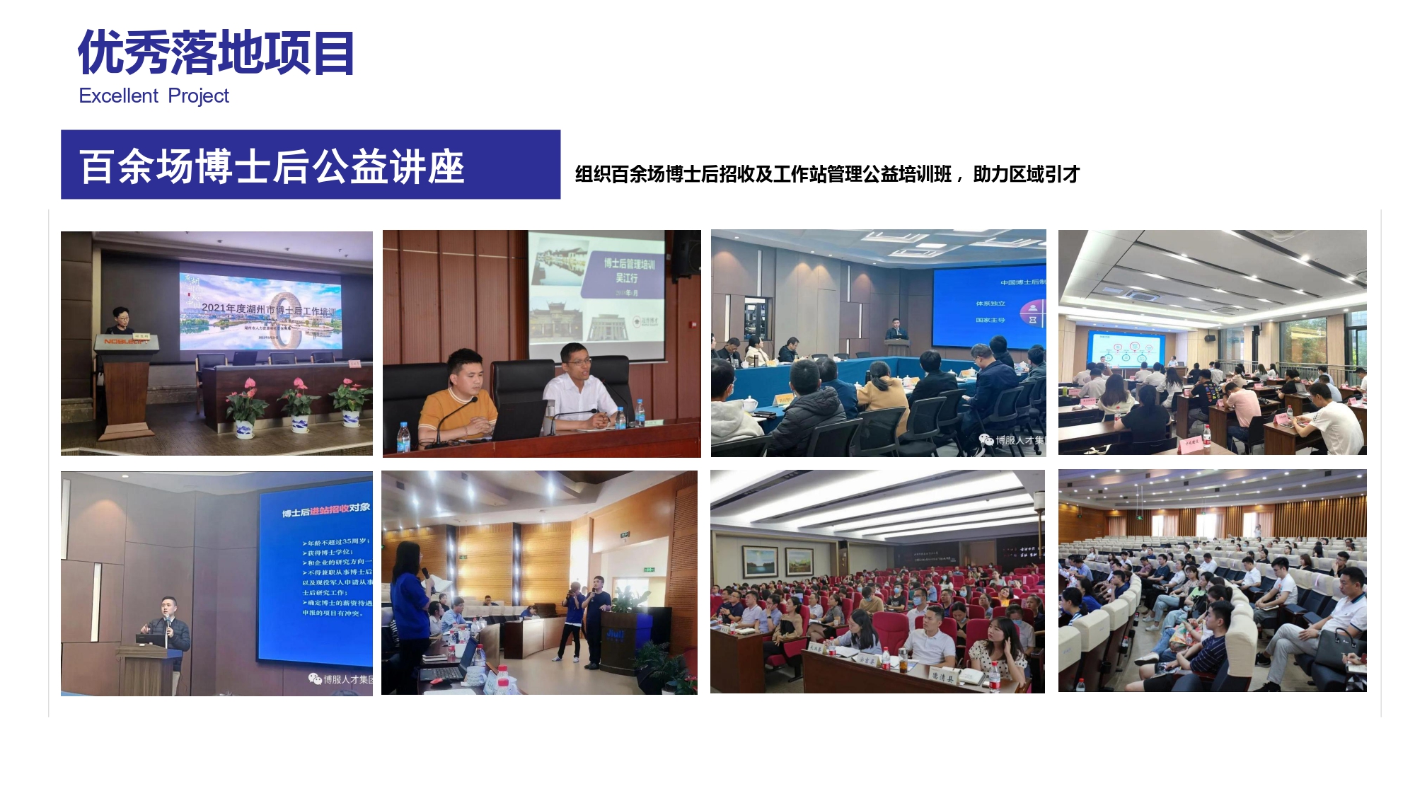 集团深度赋能高校和企事业单位,与100 + 重点高校、2000 + 高端客户,建立了海内外人才引进、载体建设、产学研合作及项目申报咨询的深度合作关系。多年来,集团深耕不辍,行稳致远。多次承办博士(后)及高层次人才项目对接洽谈会、国内外校园招聘会,组织百余场博士后招聘和管理公益培训、人才论坛等,助力区域引才。近年来,集团以数字化转型为驱动,以博士后特色服务为引领,以海外引才和城市引才为重点,打造博服人才集团核心竞争力和行业生态产业链,厚植高端人才为科技创新与城市发展注入强劲动力。