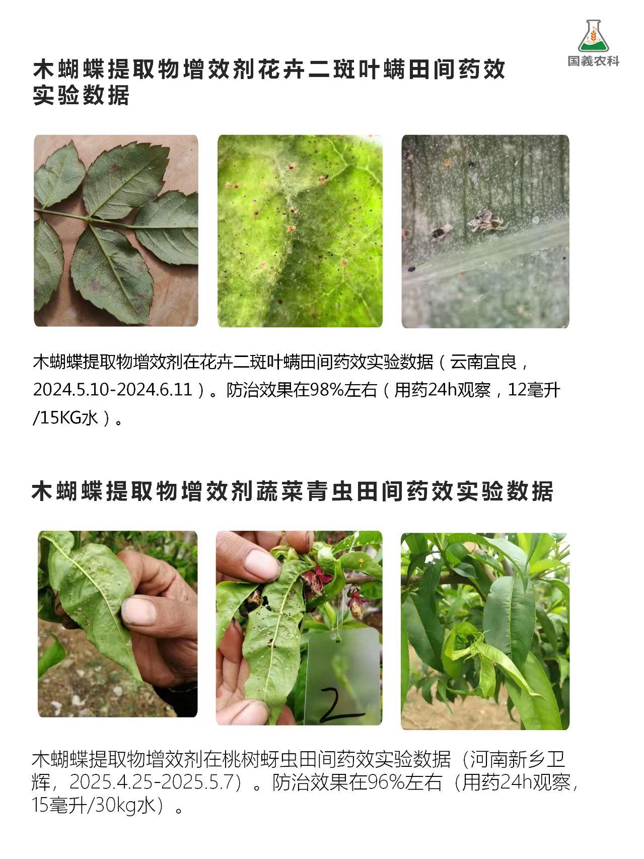 四川眉山地区反馈使用国义农科木蝴蝶提取物增效剂混配45%联肼乙螨唑柑橘红蜘蛛防治效果高达99%;四川攀枝花地区反馈使用国义农科木蝴蝶提取物增效剂混配螺虫乙酯防治经作介壳虫效果99%;四川成都地区反馈使用国义农科木蝴蝶提取物增效剂混配螺虫噻嗪酮防治经作介壳虫效果100%。
