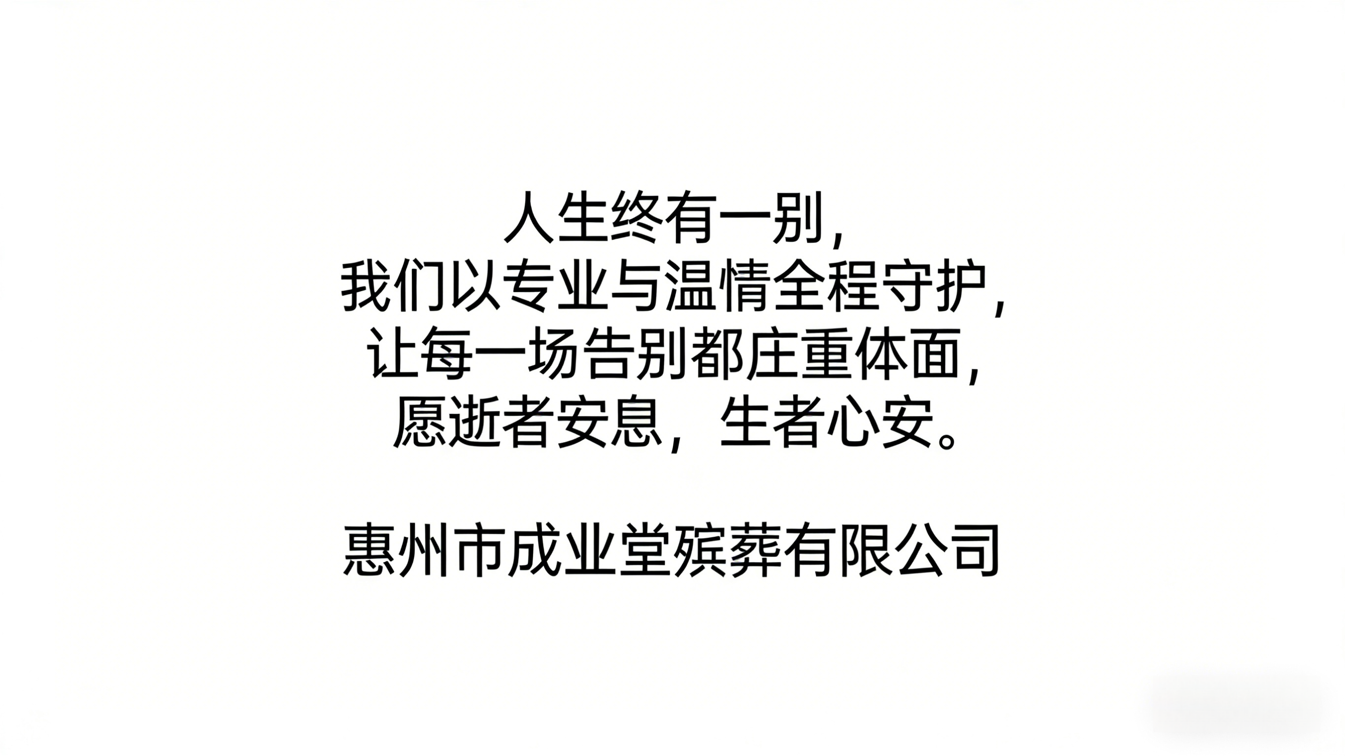 惠州市成业堂殡葬有限公司始终坚守“专业化、人性化、定制化”的核心服务理念,践行“诚信殡葬,真诚服务”的服务宗旨。多年来,公司全力为惠州及周边区域群众提供全方位、高品质的白事服务,切实解除了广大市民的治丧烦恼。
