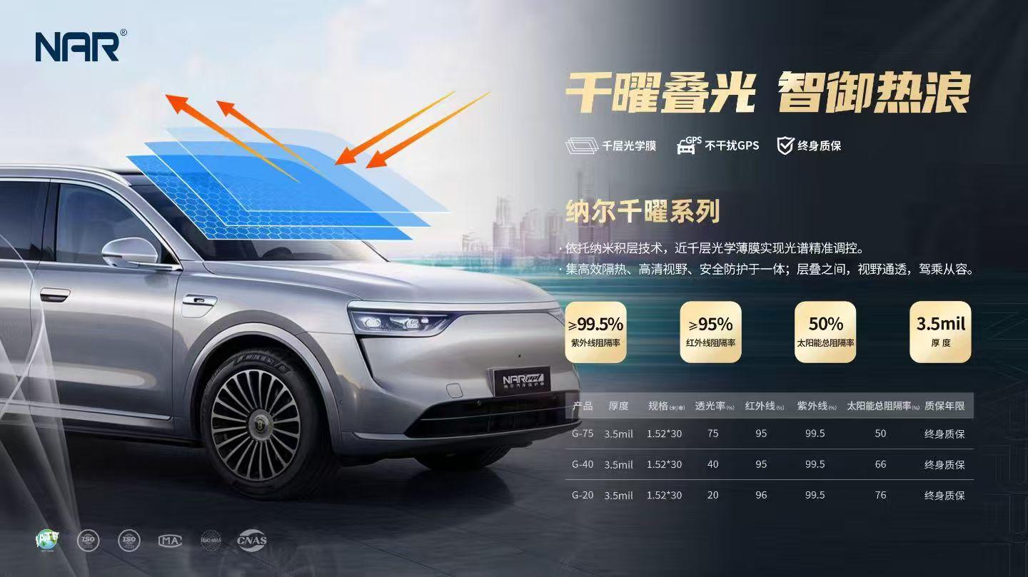 南京赛博改装贴膜纳尔全球工厂直营店主营多种优质产品。其主营产品包括南京纳尔侧后挡窗膜产品,这种窗膜具有良好的隔热效果,能有效阻挡紫外线和红外线,保护车内装饰不被晒褪色,同时也能为车内创造一个相对凉爽的环境。江苏纳尔汽车窗膜安装服务,专业的安装团队拥有丰富的经验和精湛的技术,能够确保窗膜安装得平整、牢固,避免出现气泡、褶皱等问题。南京纳尔前挡隔热膜门店提供的前挡隔热膜,不仅隔热性能出色,还具有高清晰度,不会影响驾驶员的视线,保障行车安全。南京纳尔纳米陶瓷隔热膜服务商提供的纳米陶瓷隔热膜,采用先进的陶瓷技术,具有隔热、防爆、防紫外线等多种功能,是一种性能优良的汽车窗膜。江苏纳尔单向透视膜公司提供的单向透视膜,从车内可以清晰看到车外的情况,而从车外则很难看清车内,保护了车内的隐私。
