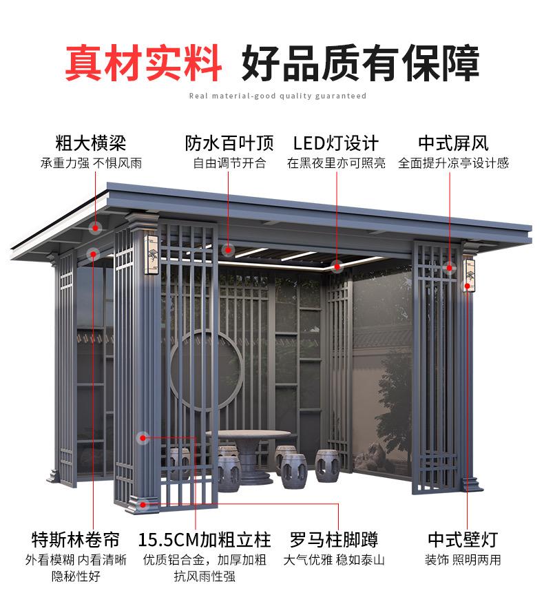智能翻板凉亭:这是该公司的特色产品之一,融入了智能技术。用户可以通过*****或者遥控器控制凉亭的翻板开合,根据不同的天气和光照条件进行灵活调整。在阳光强烈时,将翻板合上,有效阻挡紫外线;在阴天或者需要通风时,打开翻板,让空气流通。这种智能设计为用户带来了更加便捷和舒适的使用体验。