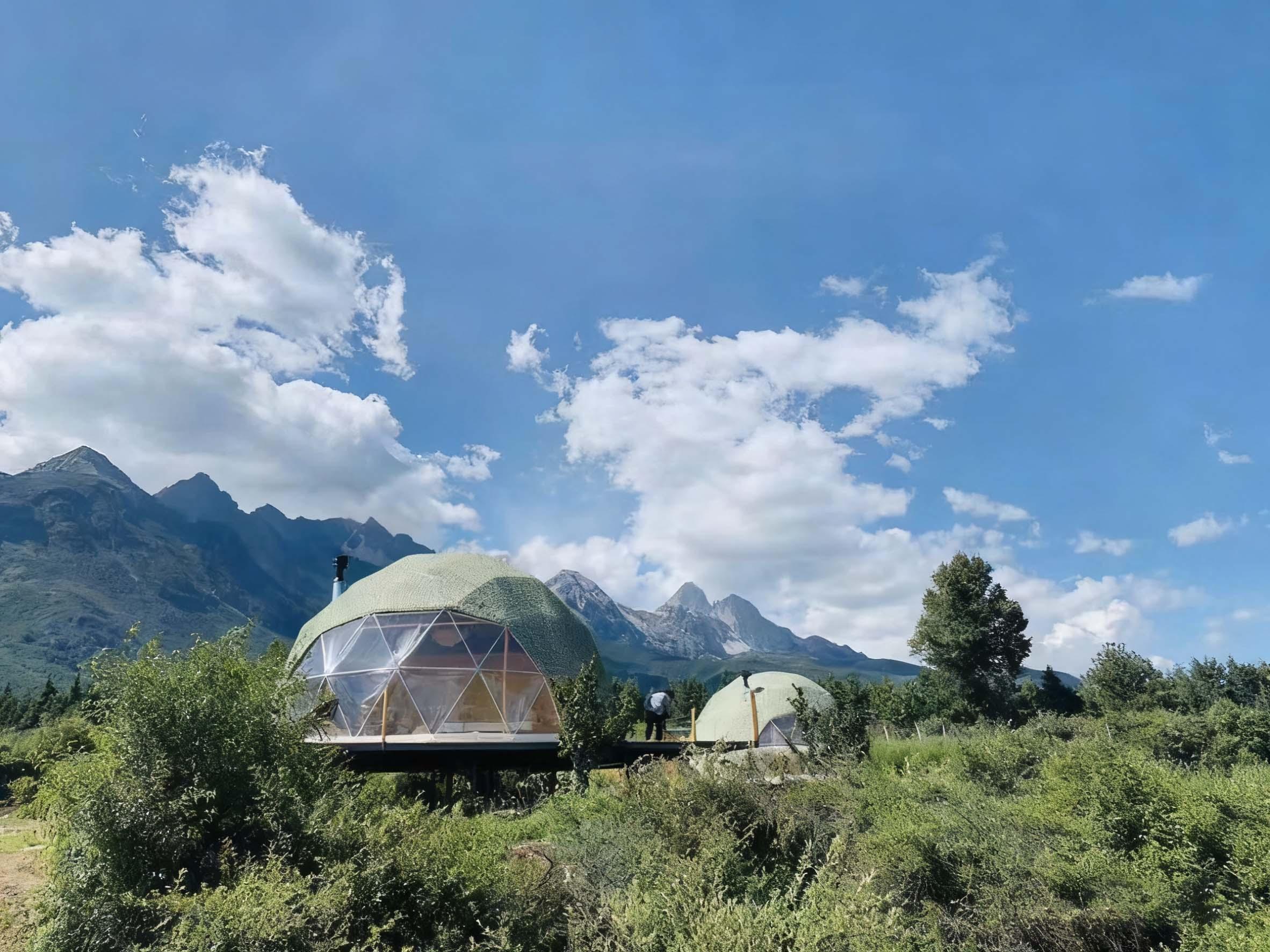 星空房帐篷结合了星空球形帐篷和球形透明帐篷的优点。它既具有球形的独特外观,又能让人们在夜晚欣赏到美丽的星空。星空房帐篷内部空间宽敞,设施齐全,可以为居住者提供舒适的住宿环境。它广泛应用于旅游度假区、民宿等场所,成为吸引游客的一大亮点。