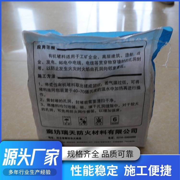 廊坊瑞天防火材料有限公司的柔性有机堵料具有诸多特点。它具有良好的可塑性,能够根据需要随意揉搓成各种形状,方便施工人员进行操作。而且该堵料具有优异的防火性能,能够在火灾发生时有效地阻止火势蔓延,为人员疏散和财产保护争取宝贵的时间。其耐腐蚀性也很强,可以在不同的环境条件下长期使用,不易受到化学物质的侵蚀。