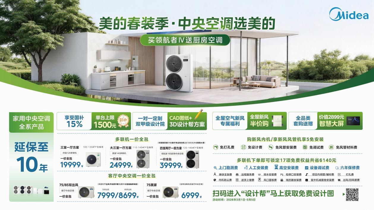 活动时间为2026年3月1日—5月5日,在这个时间段内,消费者可以尽情挑选适合自己的美的空调产品。