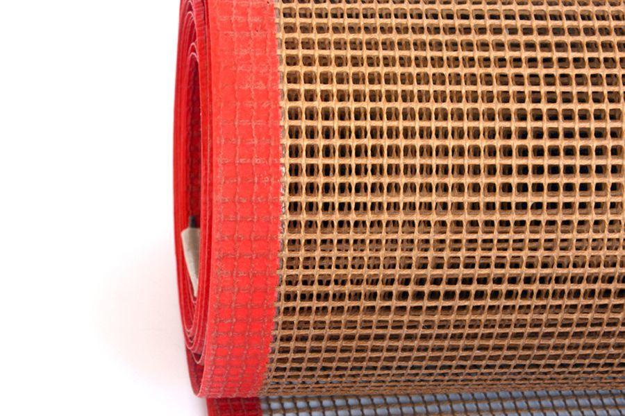PTFE(特氟龙)网格输送带是以悬浮聚四氟乙烯 (俗称塑料王) 乳液为原料,浸渍高性能玻璃纤维网而成,是一种高性能多用途的复合材料新产品。适用温度范围为 -140°C~280°C 之间,具有耐气候性、抗老化。耐化学腐蚀,能耐强酸、强碱、王水及各种有机溶剂的腐蚀。非粘着性使其不易粘附任何物质,易于清洗附着其表面的各种油渍、污点或其它附着物;浆糊、树脂、涂料等几乎所有粘着物质都可以简单地清除。尺寸稳定 (延伸系数小于千分之五)、强度高,具有良好的机械特性。抗弯曲疲劳,可用于较小轮径。耐药剂性、无毒性,几乎可耐所有药剂物品。透气性使其具备透气率,可减少热源耗费、提高干燥效率。