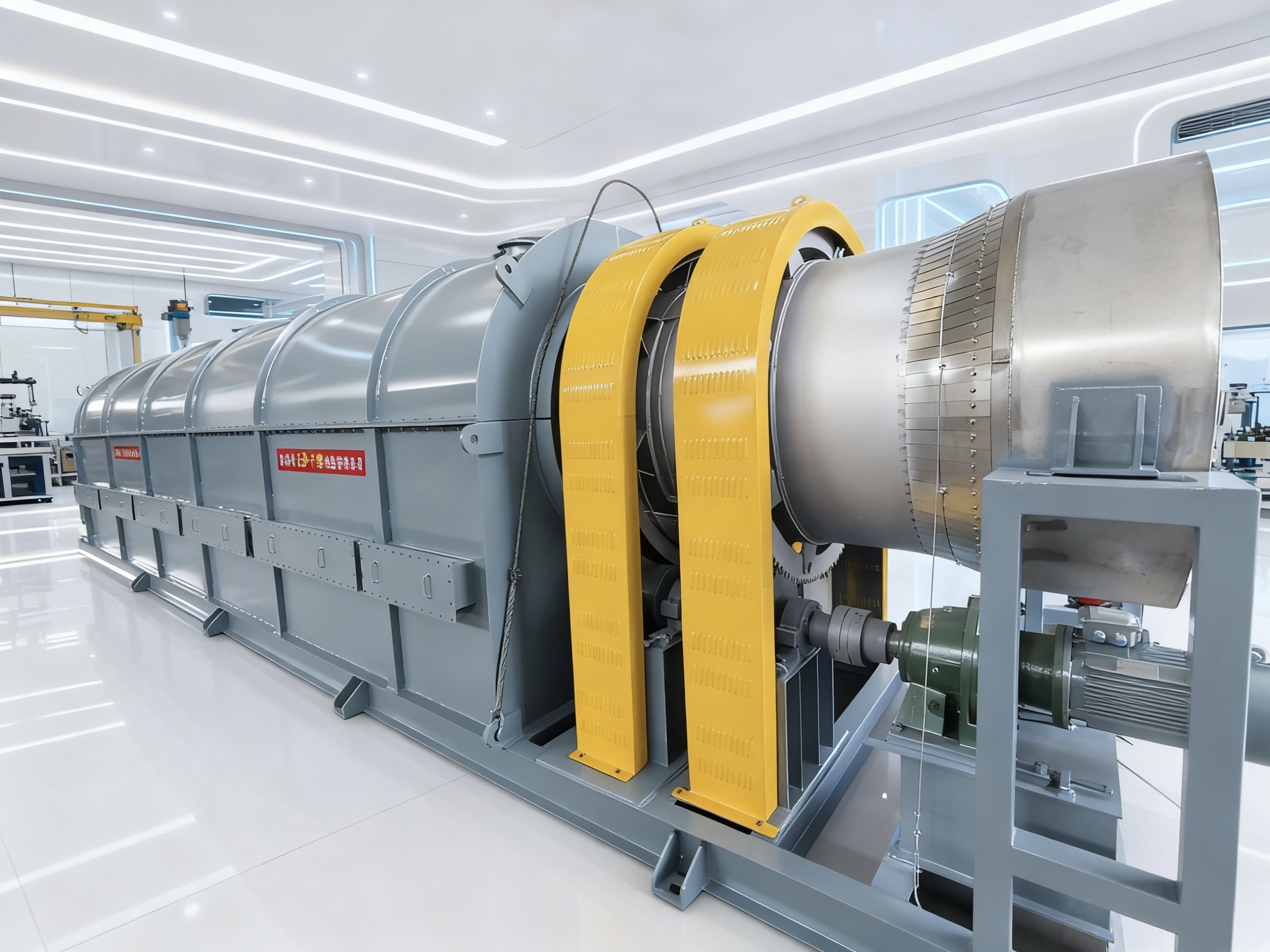 高温回转滚筒干燥机是常州市元泽干燥设备有限公司的主打产品之一。它具有干燥效率高、处理量大的特点。在工作过程中,物料在滚筒内不断翻滚,与热空气充分接触,从而实现快速干燥。这种干燥机适用于各种颗粒状、粉状物料的干燥,广泛应用于化工、食品、医药等行业。例如,在化工行业中,它可以对各种化工原料进行干燥处理,提高产品的质量和稳定性;在食品行业中,可用于谷物、豆类等的干燥,保证食品的储存和加工质量。