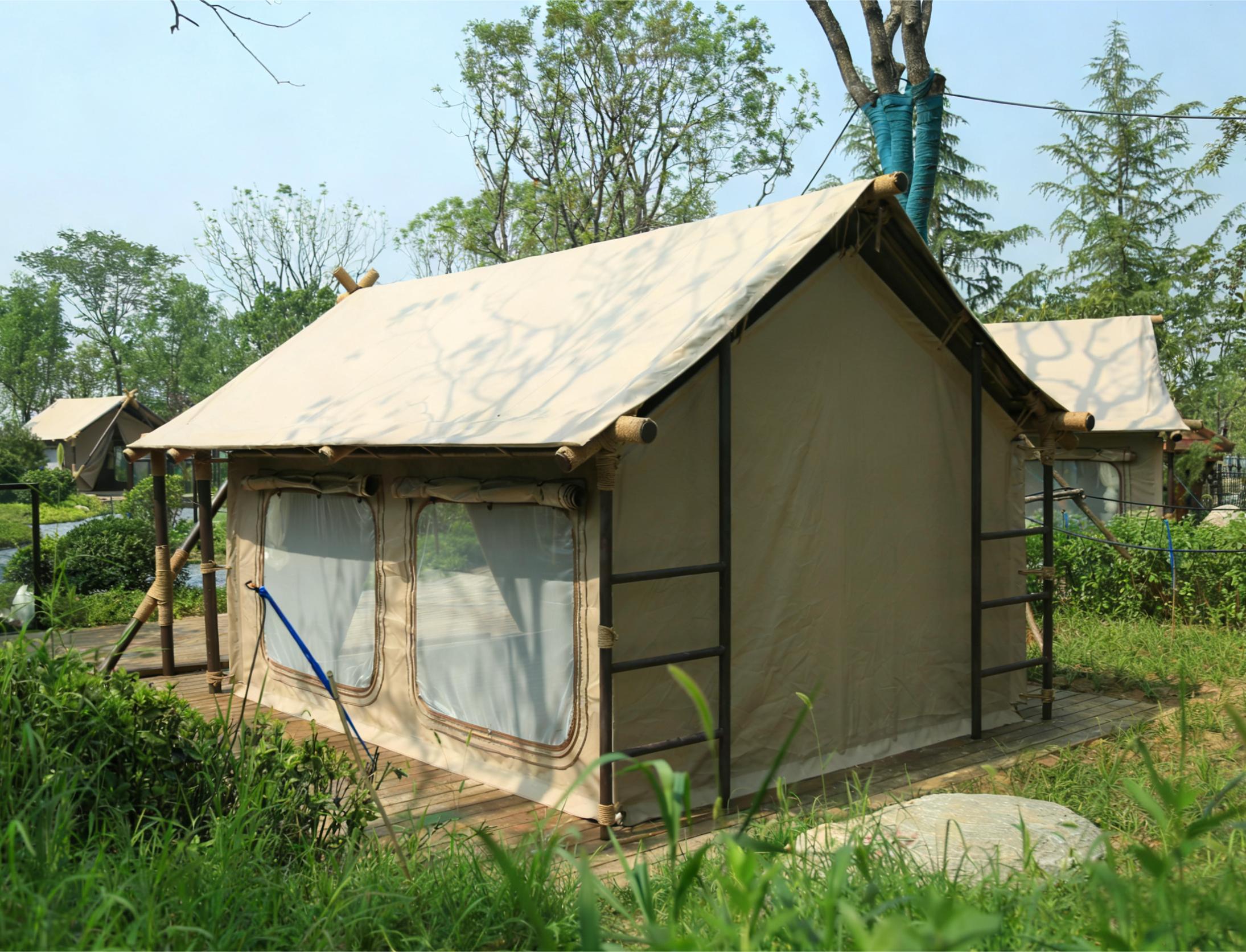 **户外住宿篷房**:适用于各种户外旅游景区、露营地等。它为游客提供了舒适、安全的住宿环境。篷房采用了优质的材料,具有良好的隔热、防水和防风性能。其设计灵活多样,可以根据不同的场地和需求进行定制。无论是小型的家庭露营还是大型的旅游度假区,户外住宿篷房都能满足需求。