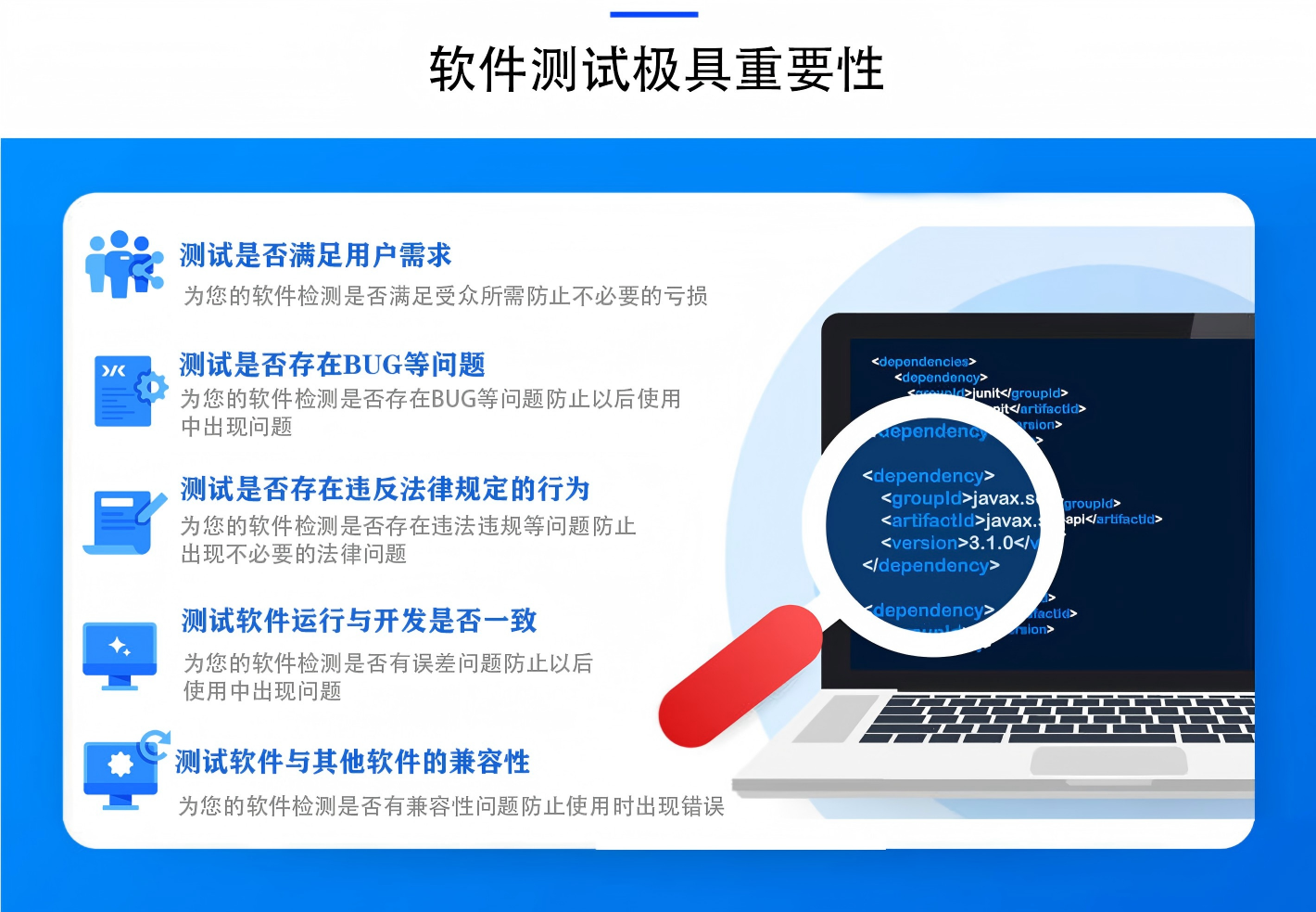 公司秉持“科学管理、持续改进、客户满意”的质量宗旨,全心全意为客户服务,用高标准严要求的质量要求对待每一个项目。其拥有专业的测试流程和方法,提供包括软件项目验收测试、软件产品登记测试、确认测试、性能测试、安全测试、漏洞扫描、渗透测试、代码审计等服务,这些服务确保了软件产品的可靠性、安全性和高性能,帮助企业提升产品质量和市场竞争力。