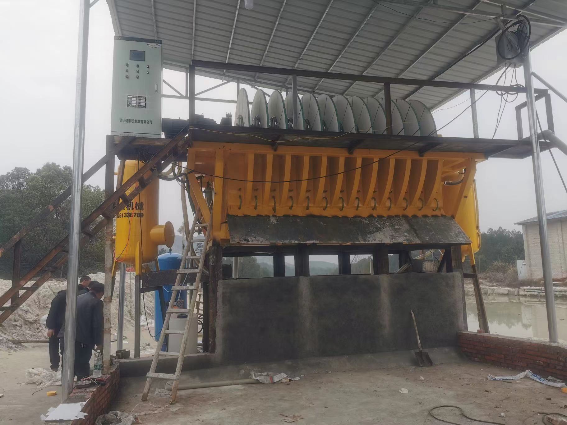 除了以上主营产品,连云港博云机械有限公司的盘式真空过滤机和陶瓷过滤机也具有独特的优势。盘式真空过滤机由各个单独的扇形片的圆盘构成,每一个扇形片为单独的过滤单元,由滤布做成布套在扇形片上形成滤室。过滤盘由电机通过减速器及开式齿轮传动来驱动,过滤盘顺时针方向转动,滤室里的矿浆在吸附区借助于真空泵在过滤介质两侧形成的压力差,附着在过滤盘上形成滤饼。搅拌器旋转防止固体沉淀,滤饼离开液面后,在真空作用下继续脱去水分。滤液透过滤布,经过滤液管,从分配头排出。滤饼在卸料区由反吹风卸料落入排料槽,整个作业过程连续循环进行。