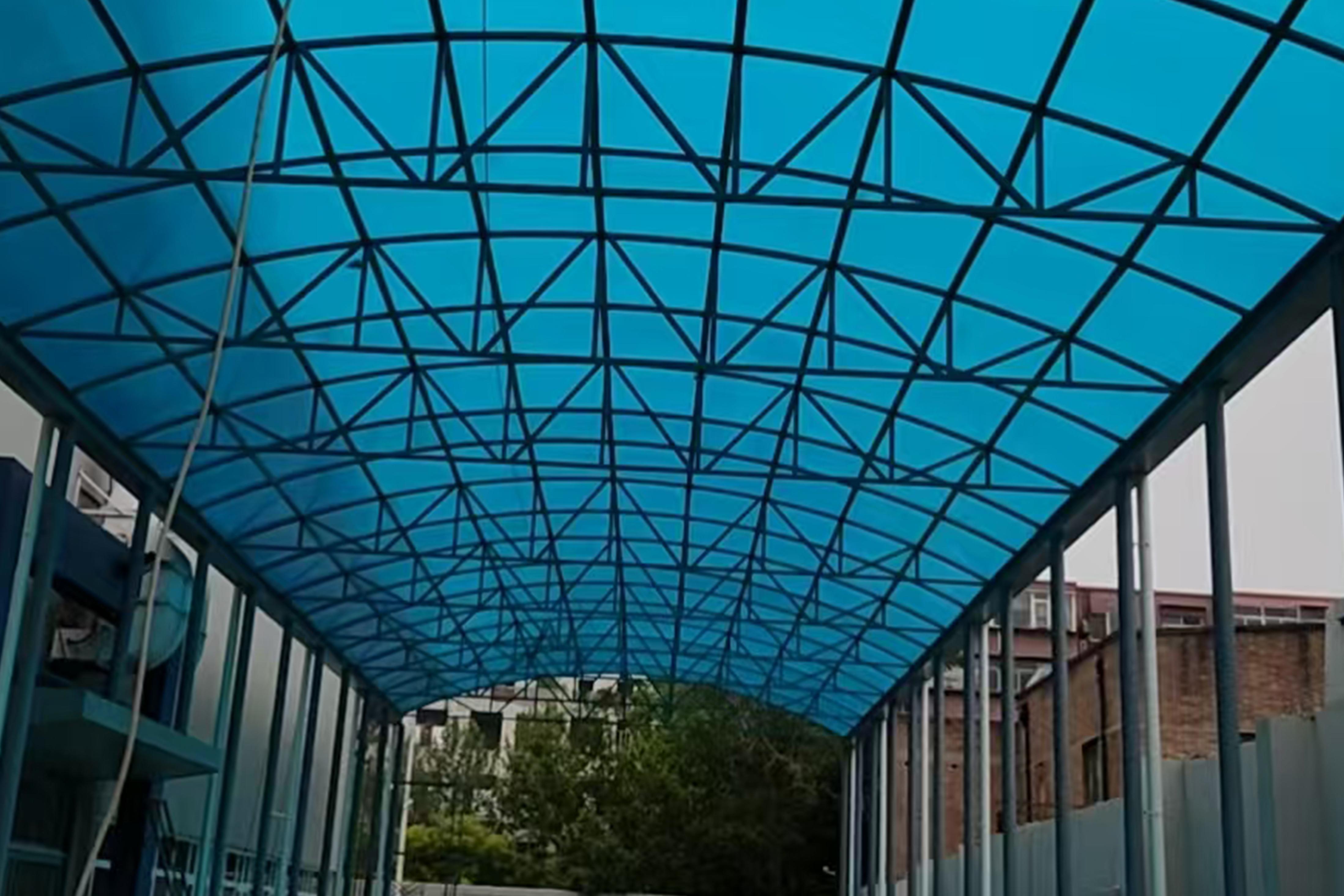 PC阳光板有双层阳光板、三层阳光板、四层阳光板、蜂窝阳光板、米字阳光板等多种类型。它具有良好的采光性,能够让室内获得充足的自然光线,同时还具备一定的隔热性能,可有效降低室内温度,节省能源。在雨棚搭建中,PC阳光板可以为人们遮风挡雨,提供一个舒适的空间。其材质轻盈,安装方便,能够减轻建筑结构的负担。