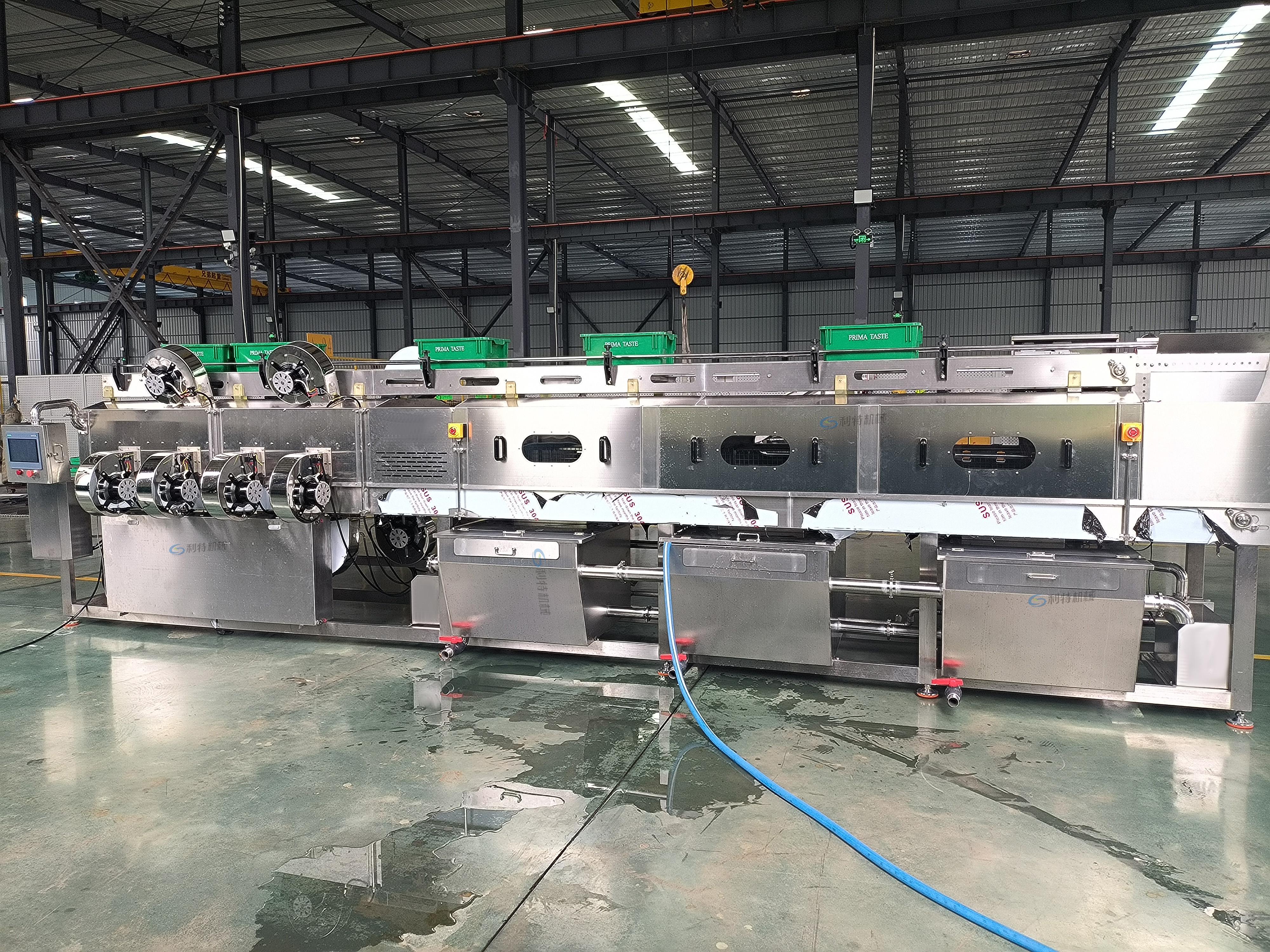 隧道式洗筐机也是诸城市利特食品机械有限公司的明星产品。这种洗筐机适用于大规模的洗筐作业。它采用隧道式结构,蔬菜筐可以通过输送带自动进入清洗隧道,在隧道内完成清洗、消毒等一系列工序。隧道式洗筐机的优点在于清洗效率高、清洗质量稳定。它可以根据不同的清洗需求,调整清洗时间和清洗强度,确保蔬菜筐能够达到理想的清洗效果。而且,该洗筐机的自动化程度高,减少了人工操作,降低了劳动强度。
