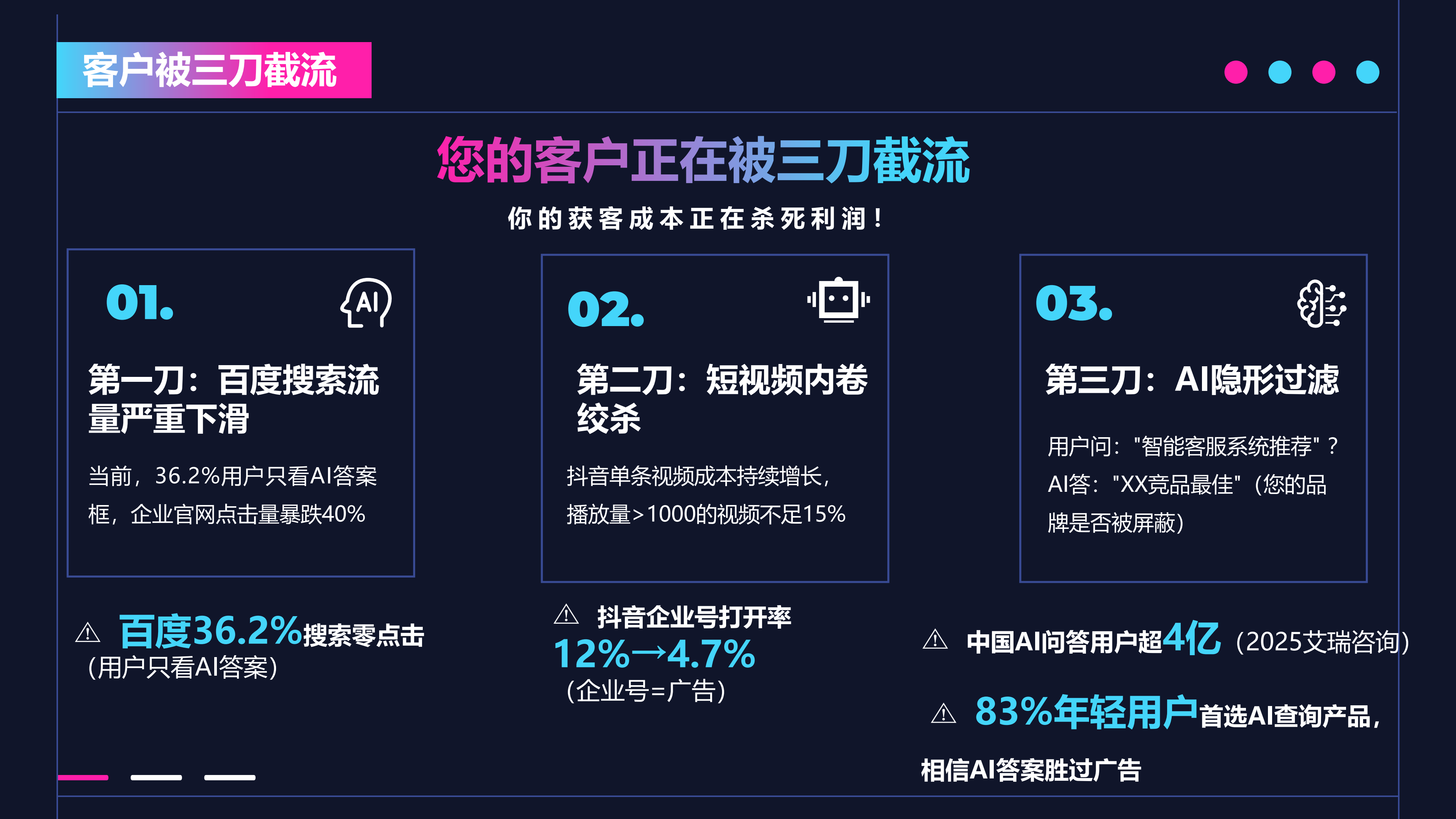 公司深知企业在网络推广和数字化转型道路上所面临的种种需求与痛点,因此为企业量身定制涵盖从抖音短视频的创意策划与精细化运营,搜索引擎的优化与高效转化,AI智能客服的搭建以及一站式网络推广的全方位布局。每一个环节都充分运用AI算法和大数据分析,洞察市场趋势与消费者需求,为企业量身定制适配其发展阶段与目标的营销方案,从而提升品牌知名度、拓展客户群体、增强市场竞争力。