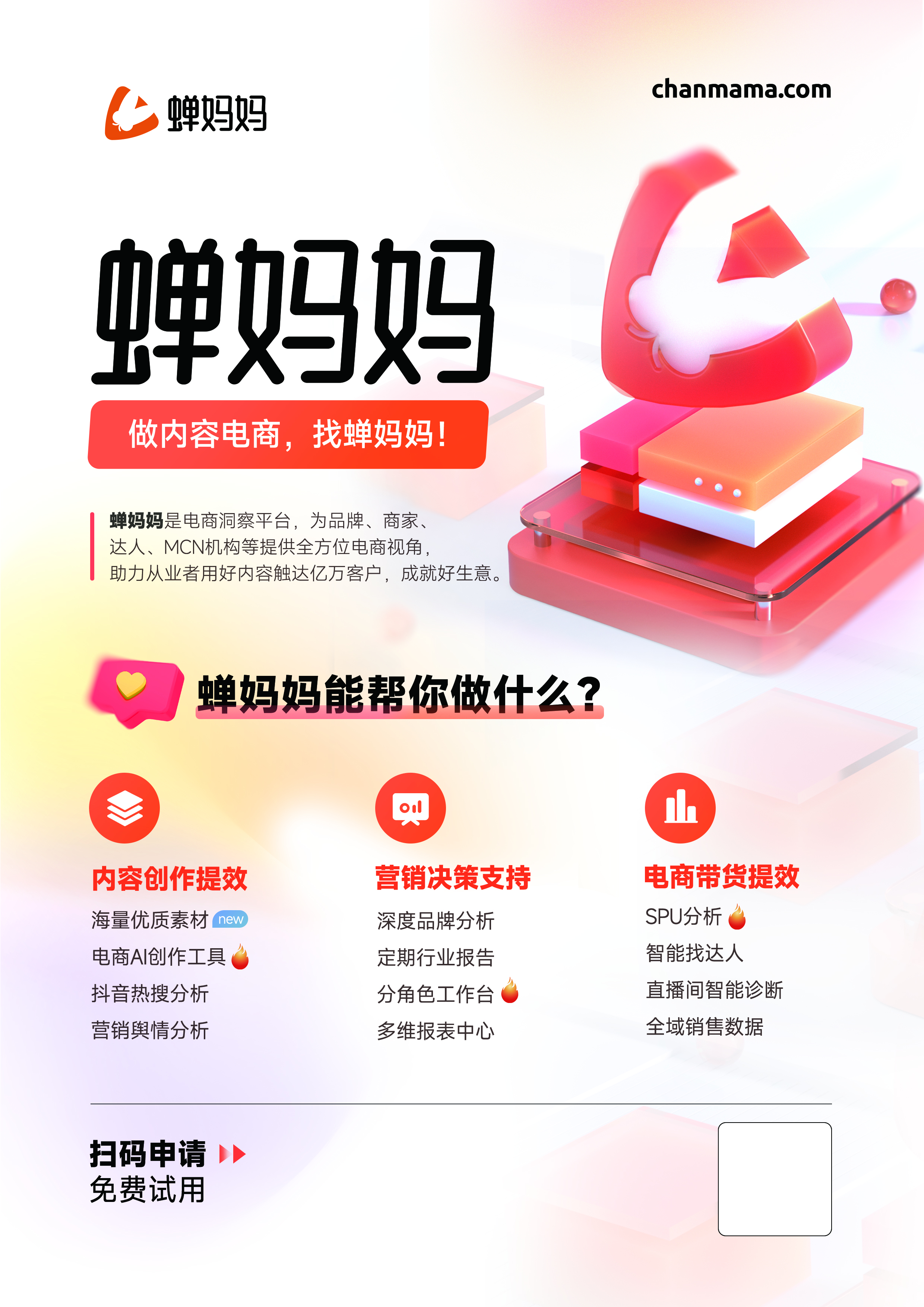 厦门蝉羽网络科技有限公司致力于营销领域的大数据与AI智能赋能,其目标是帮助品牌在内容电商时代,实现内容营销与电商的数智化经营,从而驱动品牌新增长。截至目前,该公司已经为超过100万家知名公司和中小企业提供了优质服务,展现出了强大的企业实力和市场影响力。公司旗下拥有多个产品,包括蝉妈妈、蝉妈妈·创意、蝉氪、蝉圈圈、蝉镜、JoggAI等,同时还提供蝉选等多项服务。此外,公司还获得了众多荣誉,如2022年被评为厦门市专精特新中小企业,获授CSIA软件企业证书;2021年被评为福建省数字经济领域“瞪羚”创新企业等。