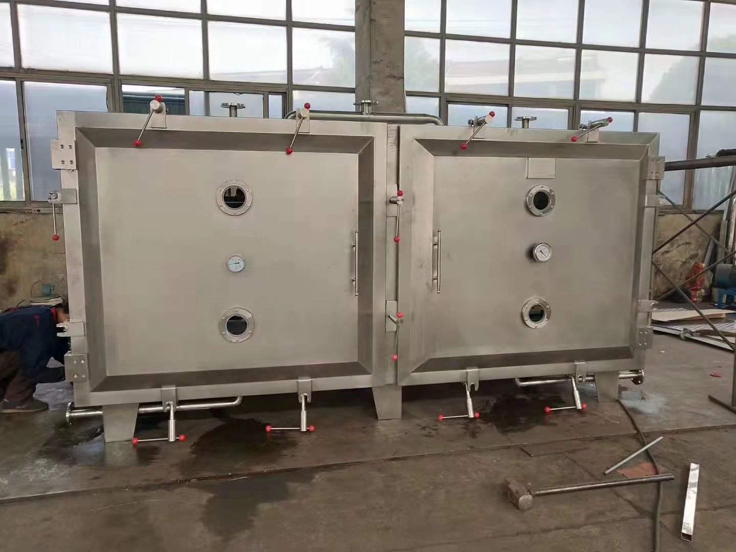 - 方形真空干燥机:也称为真空托盘干燥机,采用箱式结构,内部设有多层加热板或托盘。物料置于托盘上,在真空环境下进行静态干燥。方形真空干燥机的特点是装料量大、易于装卸、便于清洁,非常适合批次处理量较大、且需要保持物料形态完整的干燥需求。