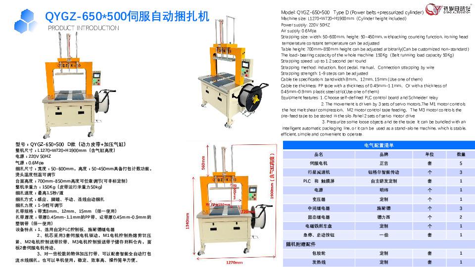 生产端,公司采用智能化生产线,引入精益生产管理体系,年产能突破 10000 台(套)。可实现从单机设备(如 QYGC 半自动款)到全流程流水线(如旋转 90 度动力滚筒捆扎线)的规模化生产。同时,公司搭建了覆盖全球的供应链网络,与正吉(伺服电机)、施耐德(继电器)、德力西(固态继电器)等国际知名部件供应商建立长期战略合作伙伴关系,确保 QYGZ、QYGC 等系列产品品质的稳定性与核心竞争力。