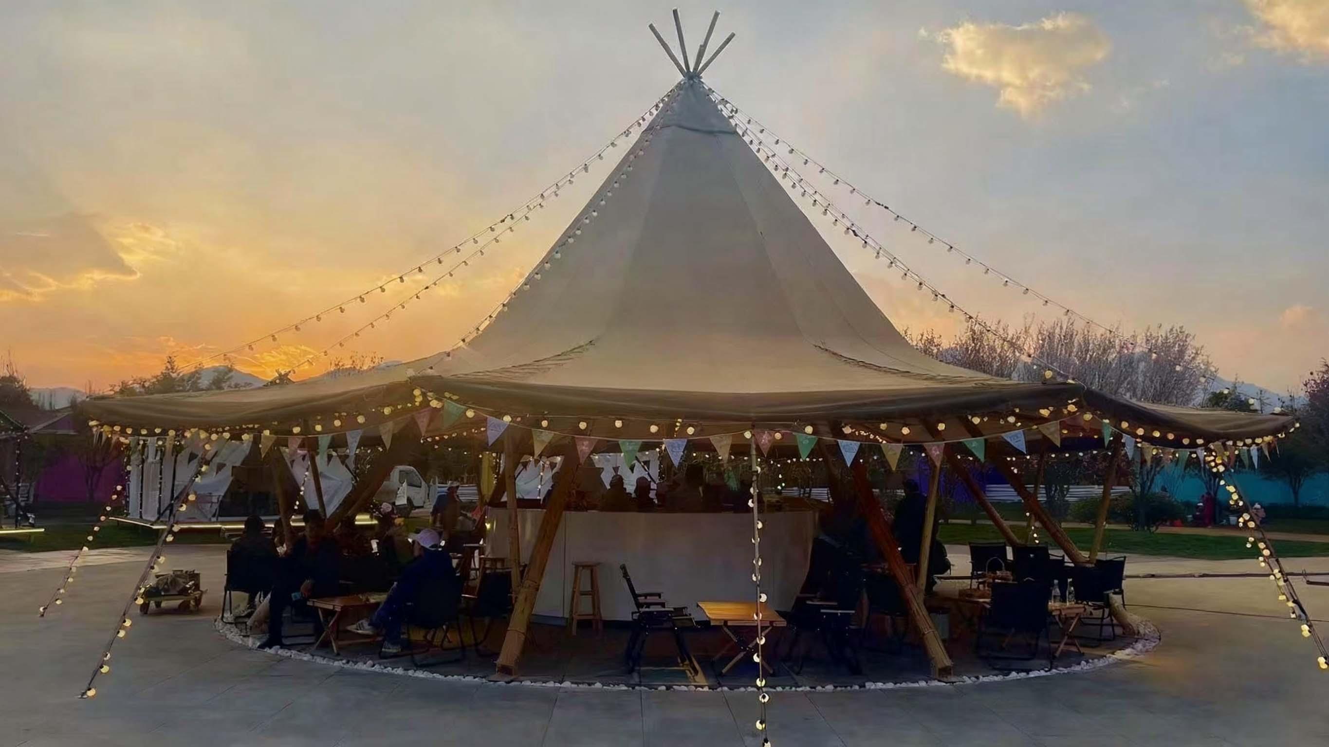 露营餐厅帐篷是为露营爱好者提供餐饮服务的理想选择。这种帐篷具有较大的空间,可以容纳多张桌椅,适合举办各种聚餐活动。帐篷的设计注重舒适和美观,同时又具备良好的通风和采光条件,让人们在享受美食的同时,也能欣赏到户外的美景。