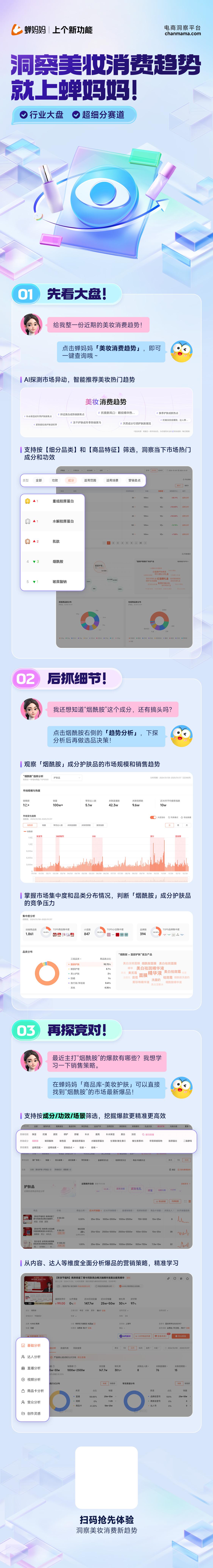 蝉妈妈创意聚焦短视频生态下的高效创作与精准营销需求,覆盖电商带货、内容创作、广告投放等多个领域。它以其独特的定位、丰富的功能和强大的赋能能力,在电商洞察领域脱颖而出。它不仅为电商从业者提供了全面、深入的数据支持和决策依据,更通过多元化的功能模块,助力从业者在营销决策、电商带货和内容创作等方面实现突破与增长。
