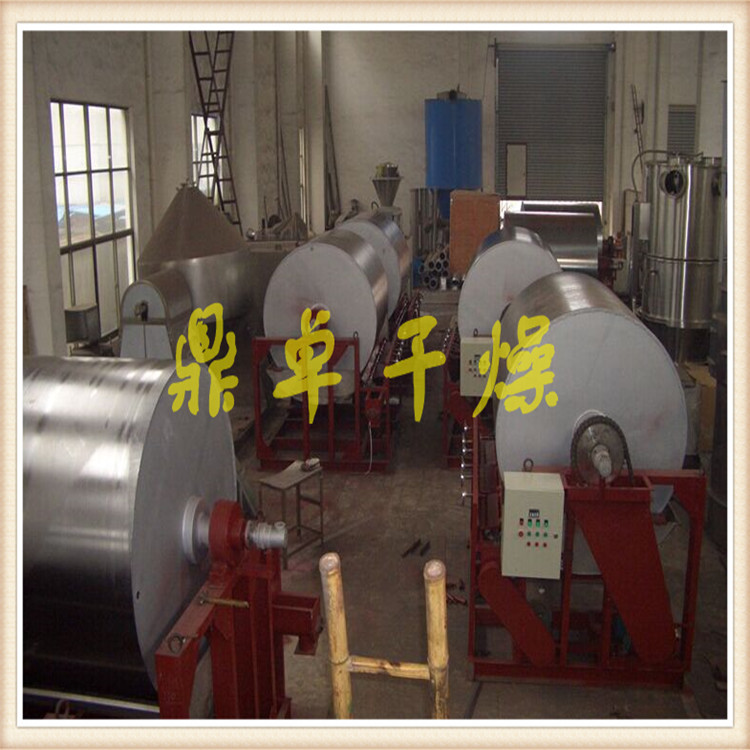 滚筒刮板干燥机是一种内加热传导型转动干燥设备,湿物料在滚筒外壁上获得以导热方式传递的热量,脱除水分,达到所要求的湿水含量.热量由筒内壁传到筒外壁,再穿过料膜,其热效率高,可连续操作,故广泛应用于液态物料或带状物料的干燥,对膏状和粘稠物料更适用。